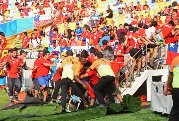 Các phóng viên tác nghiệp tại trung tâm báo chí đặt trong khuôn viên SVĐ Maracana được một phen hốt hoảng khi có khoảng hơn 100 CĐV mặc áo thi đấu của ĐT Chile tiến vào đập phá cửa kính và rào chắn ngay trước thềm cuộc so tài giữa Tây Ban Nha và Chile. Không dừng lại tại đây, nhóm fan quá khích này còn đạp đổ bức tường tạm ngăn giữa trung tâm báo chí với lối vào SVĐ.
