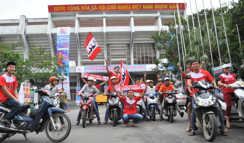 | Như thường lệ, trước mỗi trận đấu dù là giải trẻ hay giải chuyên nghiệp V.League, CĐV Hải Phòng luôn tổ chức diễu hành rất quy mô. |