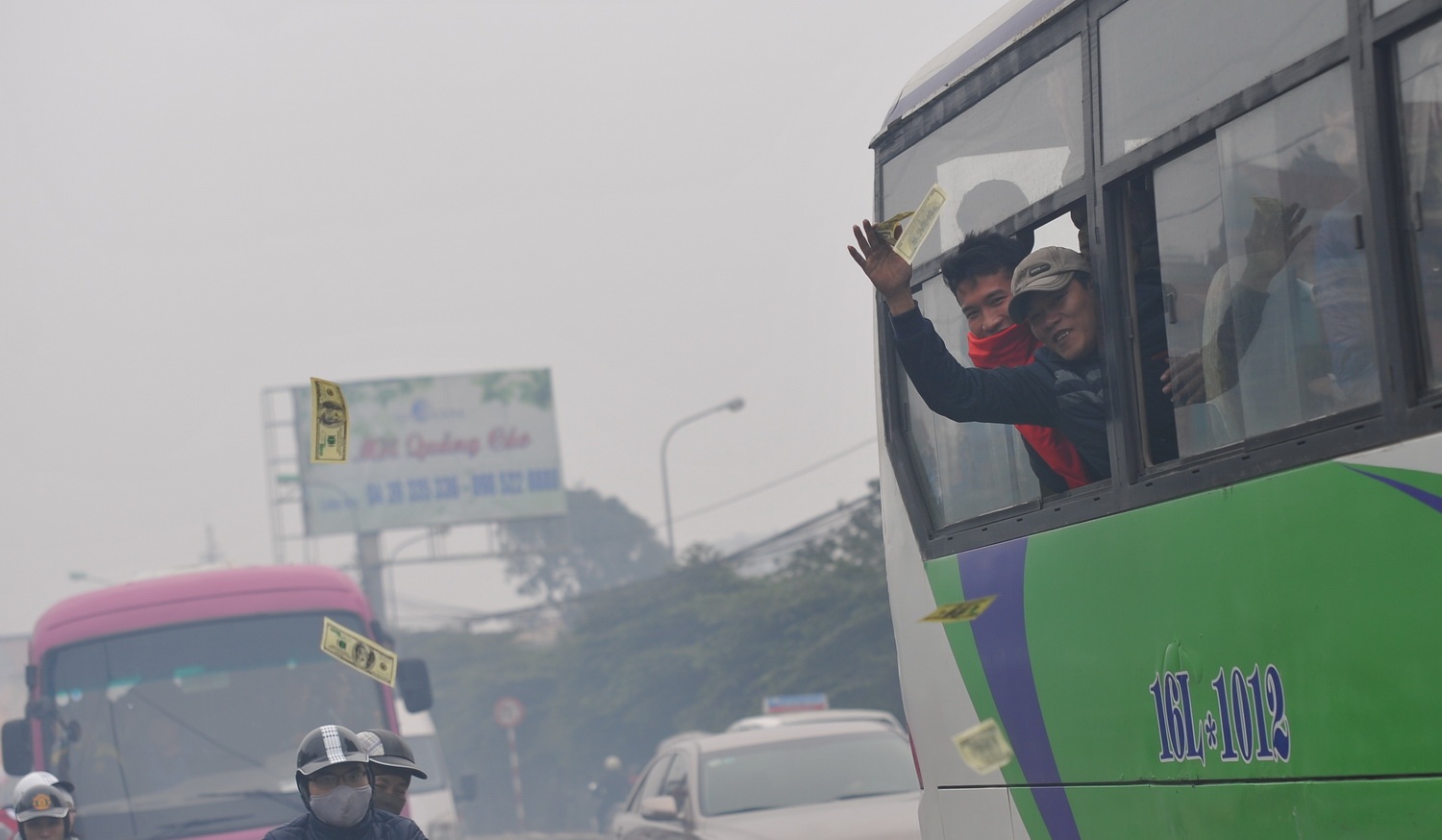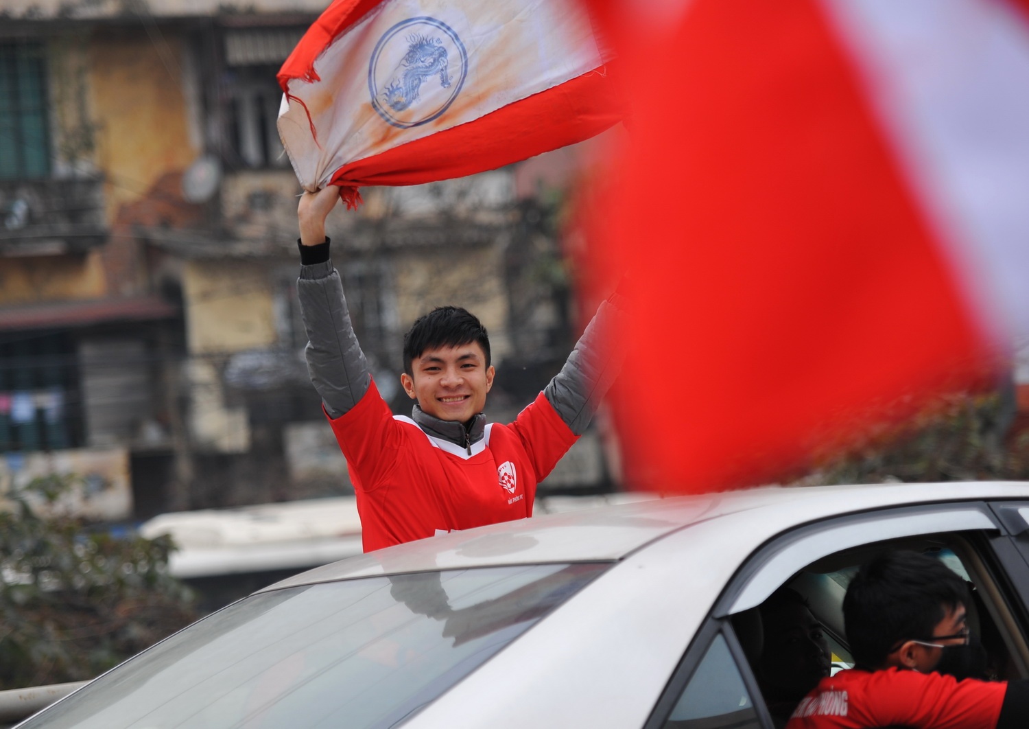 | CĐV Hải Phòng với màu đỏ đặc trưng làm náo động đường phố Hà Nội. |