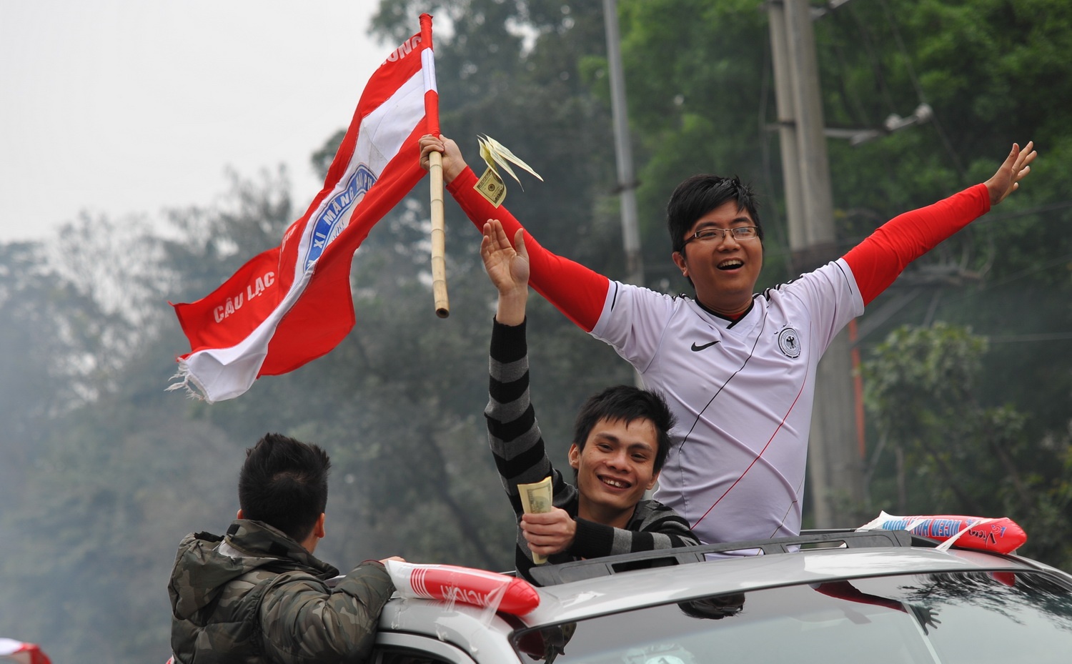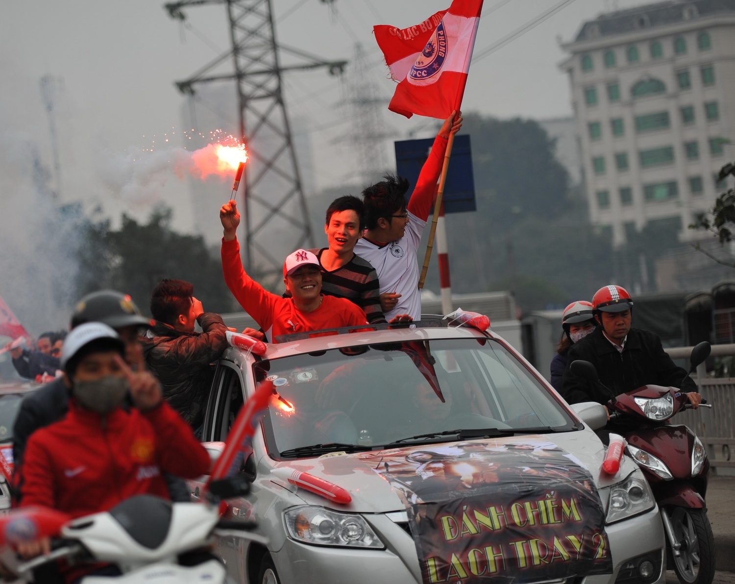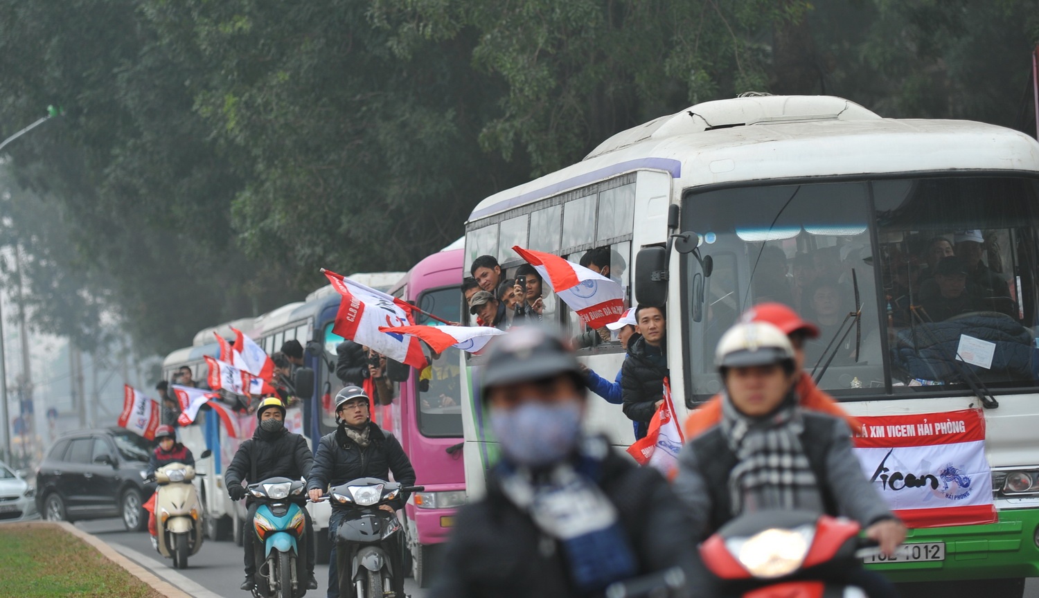 | Khoảng 15 chiếc ô tô lớn, nhỏ cùng hơn 100 xe máy diễu hành khắp đường phố Hà Nội trước khi tiến vào sân Hàng Đẫy theo dõi trận đấu giữa CLB Hải Phòng gặp Hà Nội T&T trong khuôn khổ vòng đấu thứ 5, V.League 2014. |