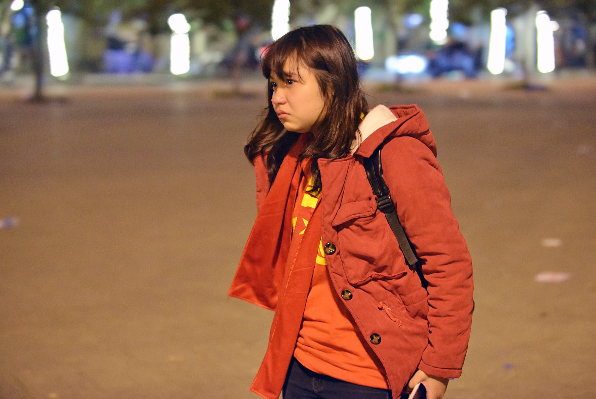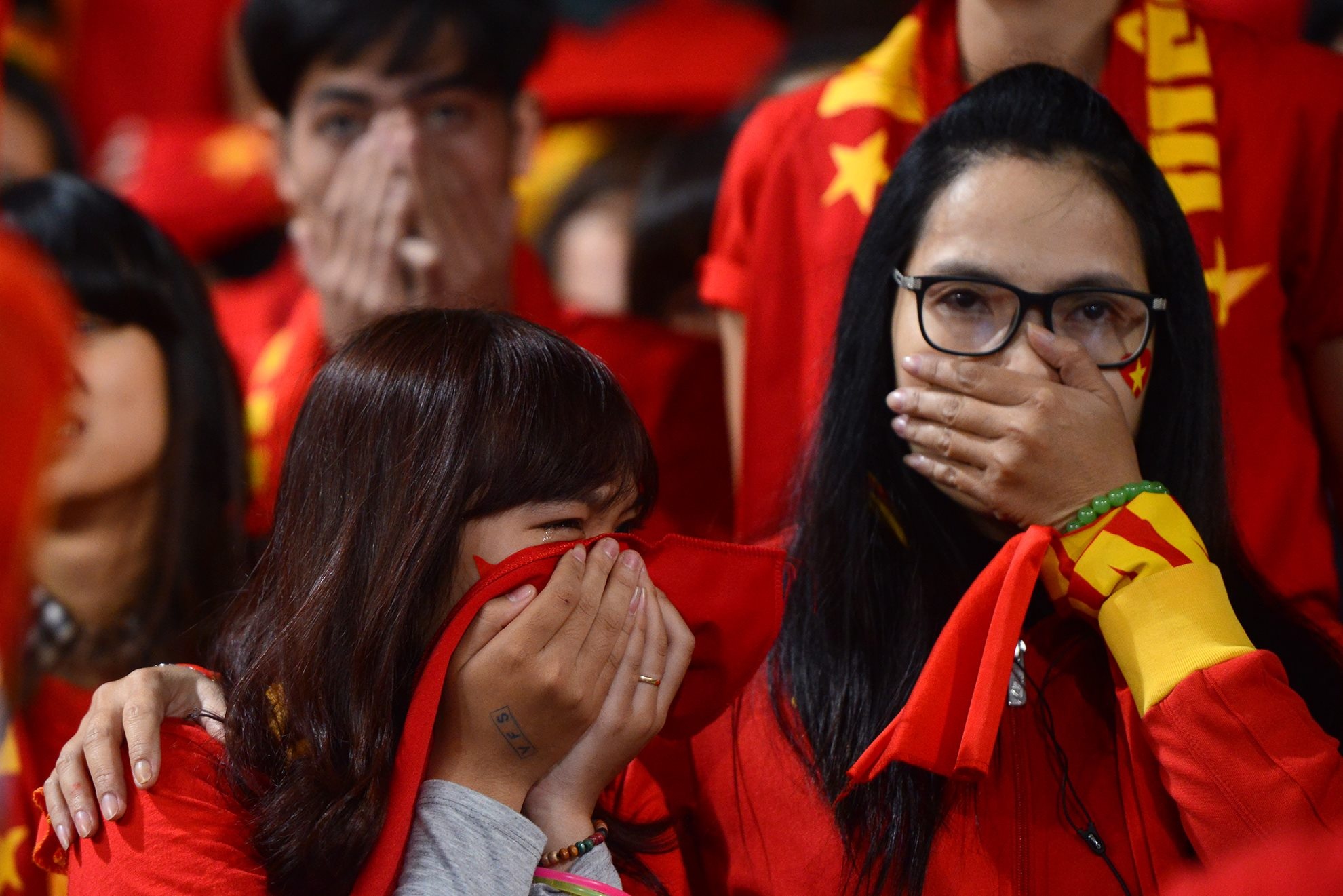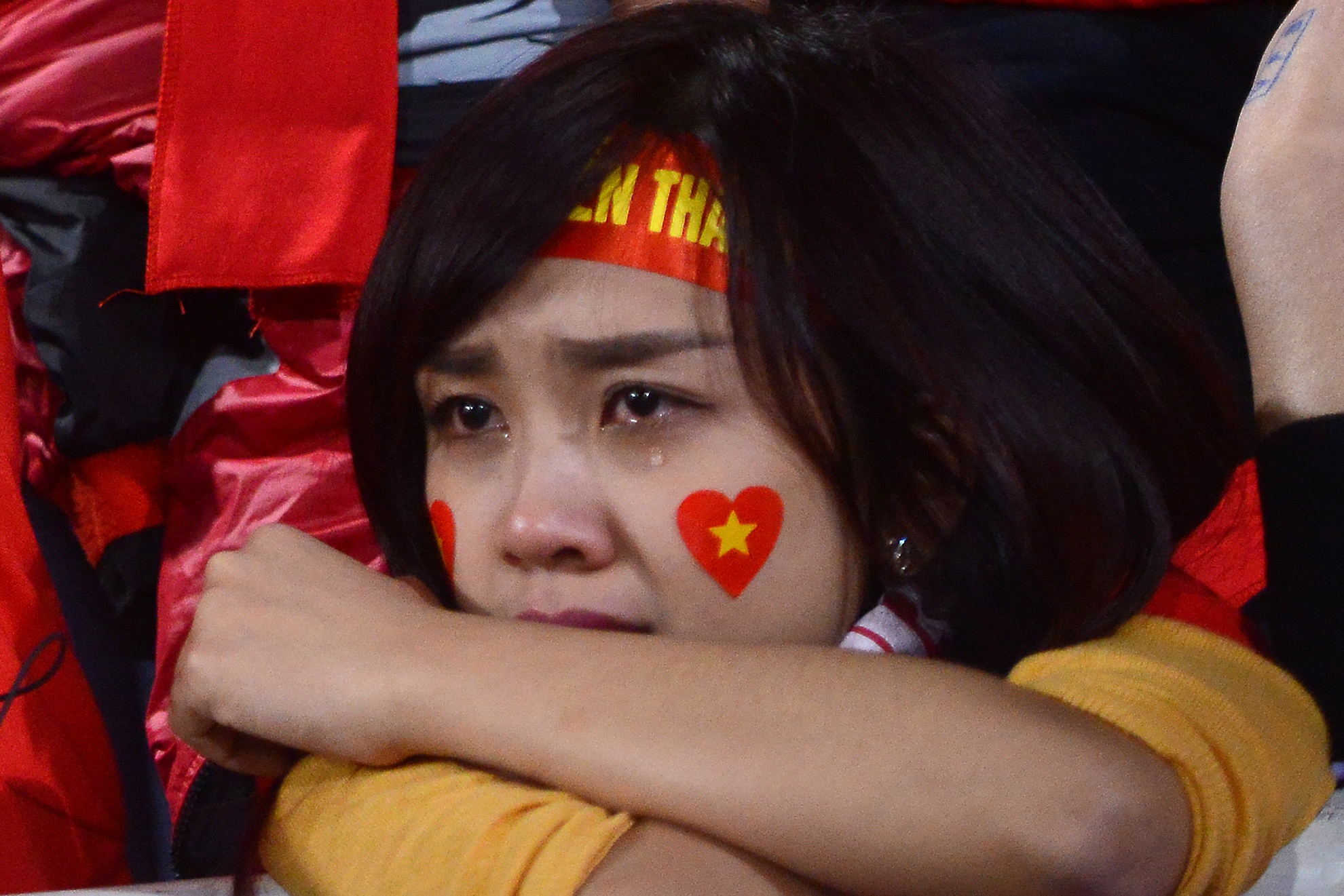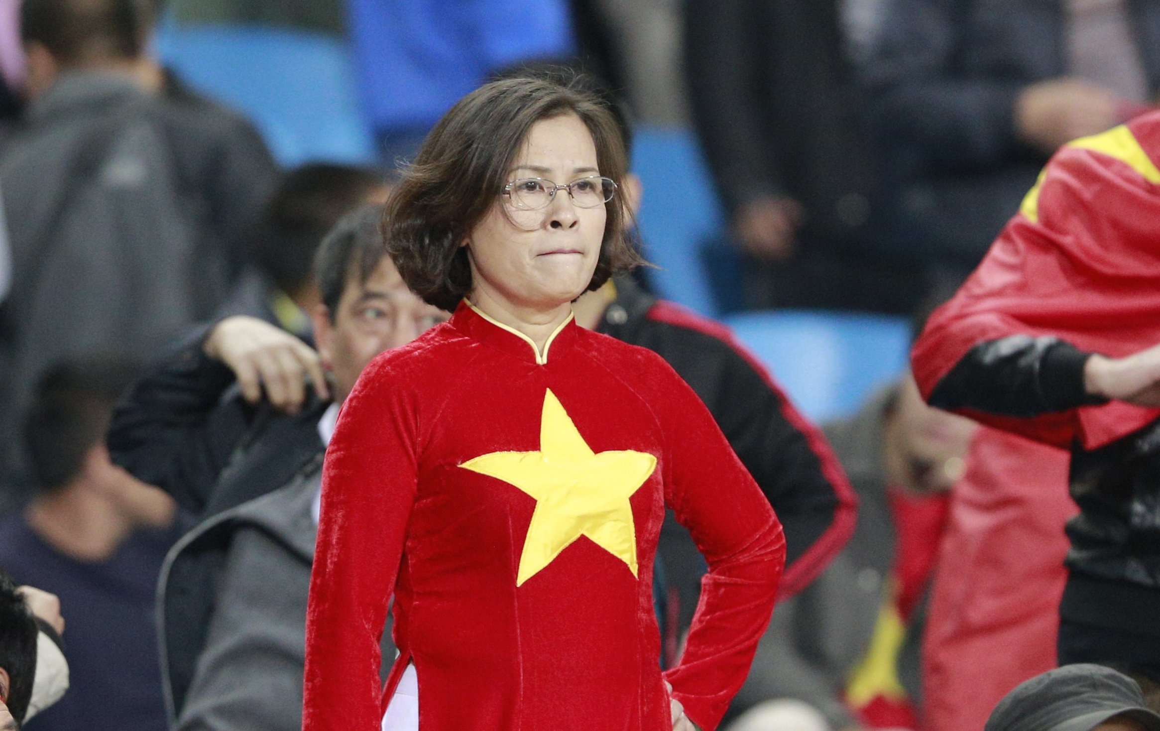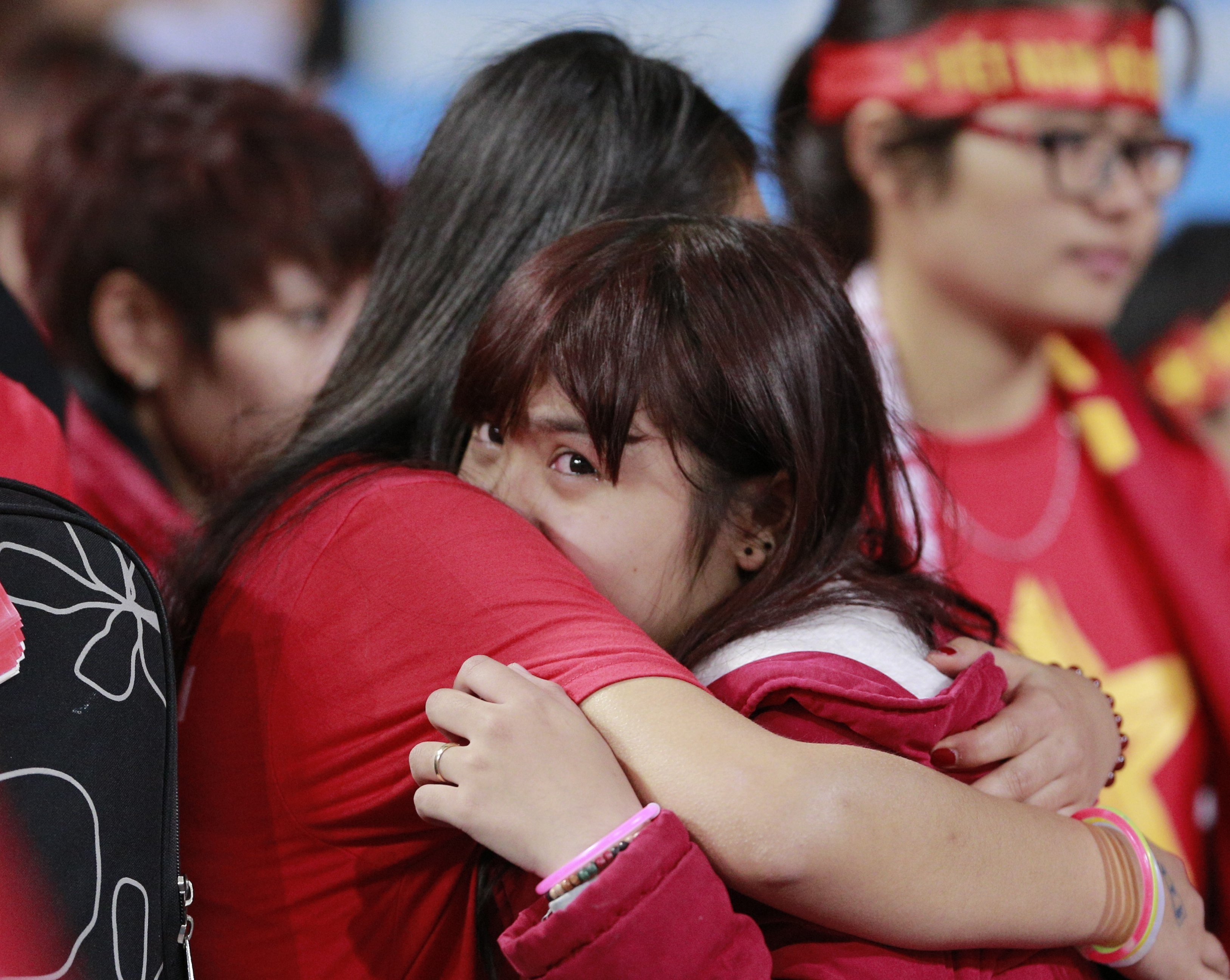 | Fan nữ mắt vẫn đỏ hoe khi rời khỏi khuôn viên SVĐ Mỹ Đình. |