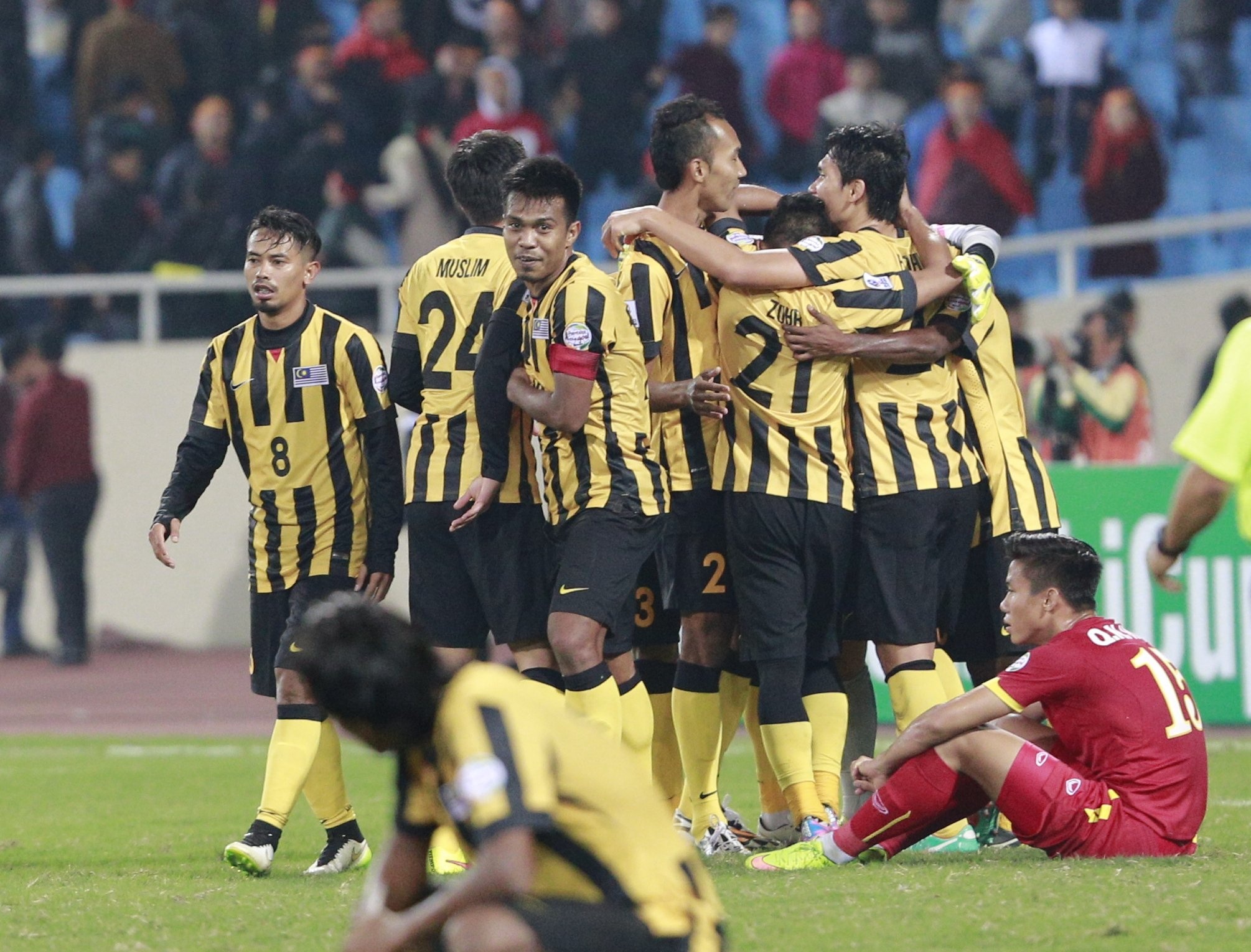 | Niềm vui của các cầu thủ Malaysia khi đánh bại ĐTVN với tỷ số 4-2 trong trận bán kết lượt về trên SVĐ Mỹ Đình. Hậu vệ Quế Ngọc Hải chết lặng nhìn đội bạn ăn mừng ngay trên sân nhà của ĐTVN. |
