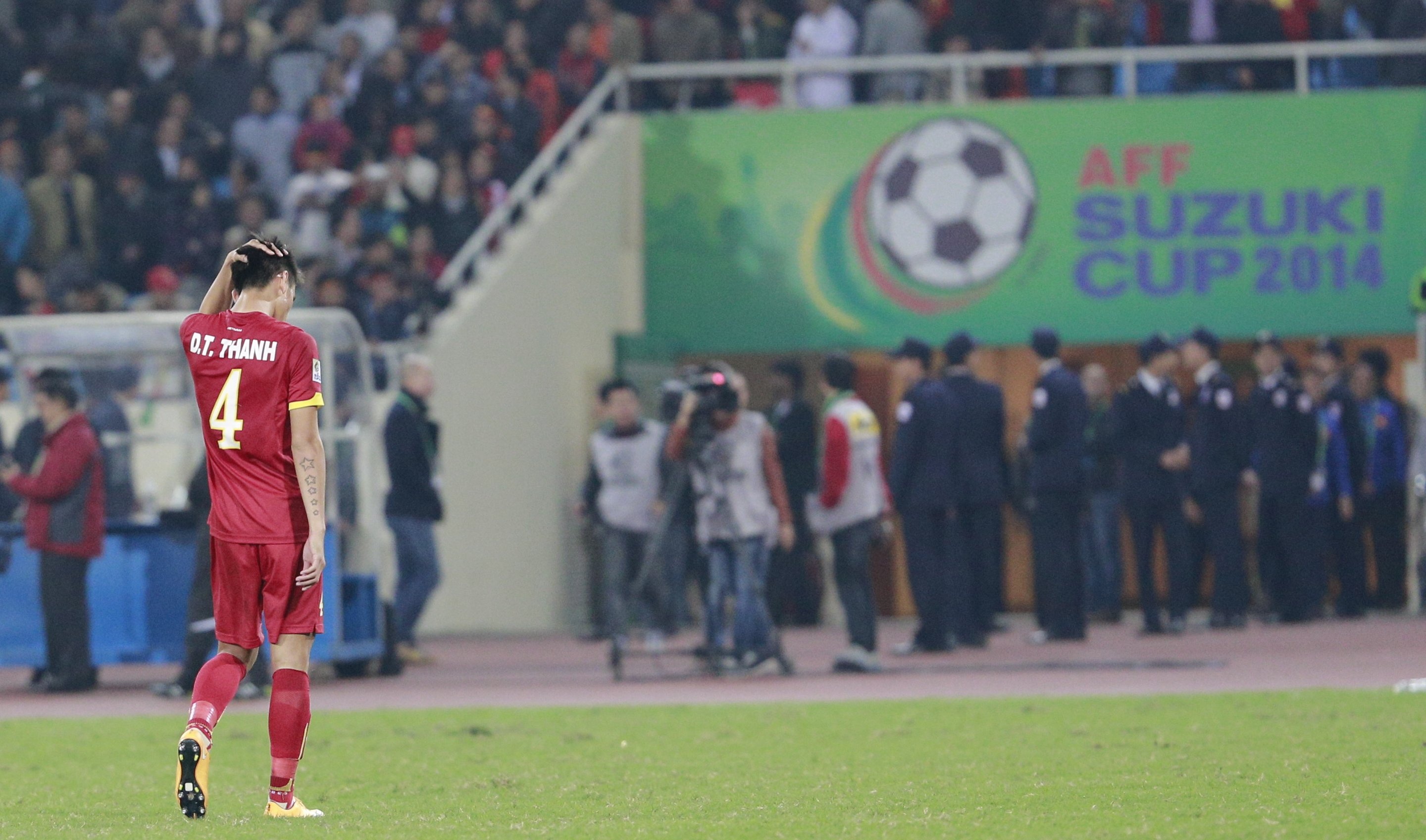 | Trung vệ Đinh Tiến Thành buồn bã rời sân và nói lời chia tay AFF Cup 2014. |