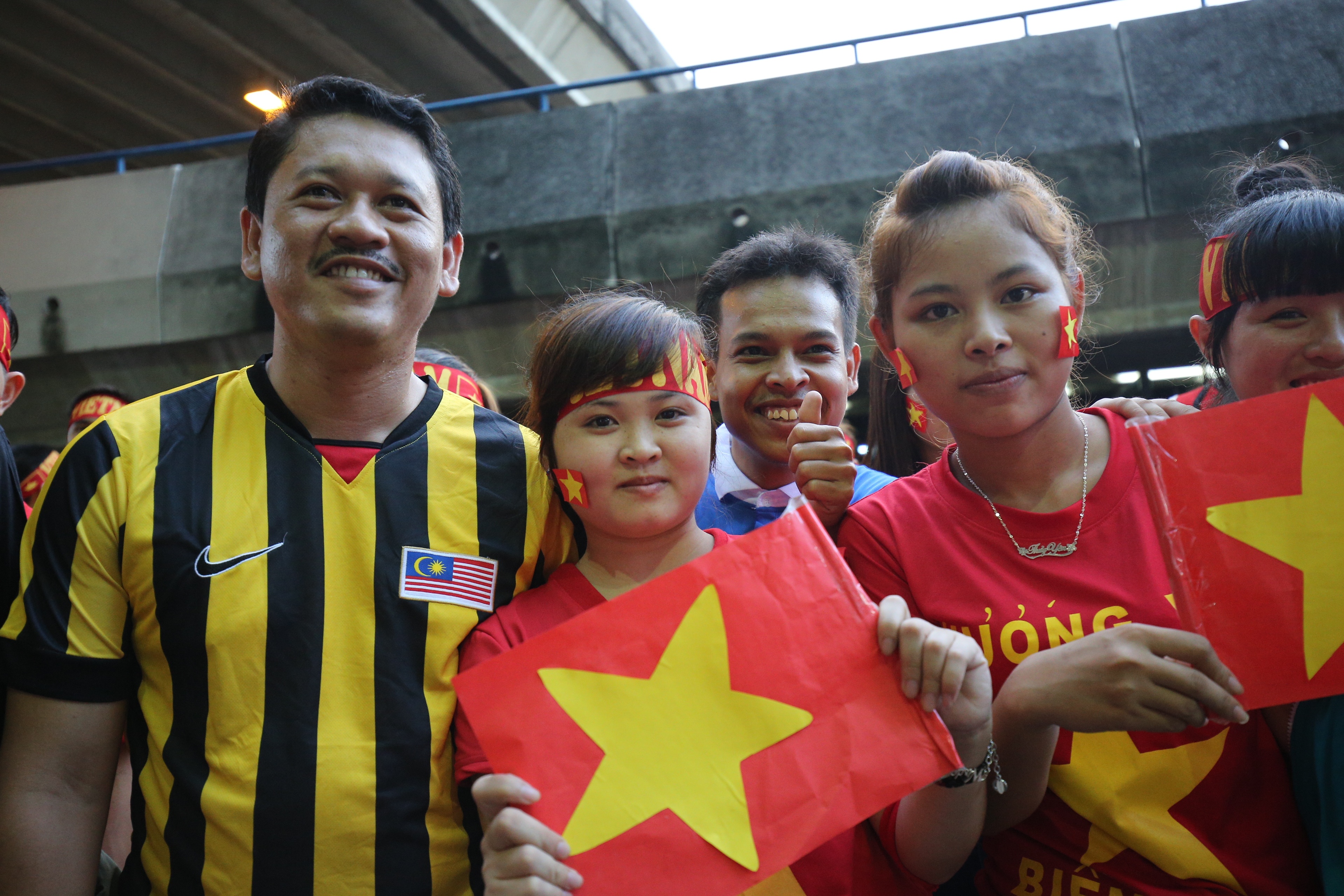 | CĐV Malaysia thân thiện chụp hình lưu niệm với CĐV Việt Nam trước trận đấu ngày 7/12 trên SVĐ Shah Alam. |
