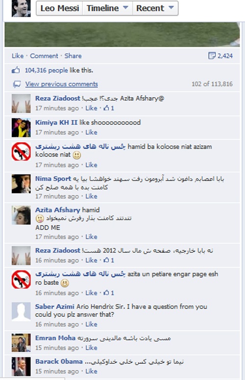 Sau khi nghe tin đội tuyển Iran sẽ phải đối đầu với Argentina trong vòng bảng World Cup 2014, hàng nghìn CĐV nước này tràn vào tấn công Facebook cá nhân của Messi. Hơn 40.000 lời bình luận thiếu văn hóa nhằm lăng mạ, bôi nhọ hình ảnh của Messi đến từ những "người lạ".