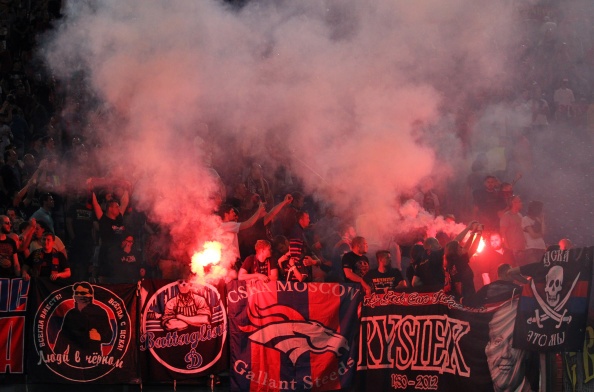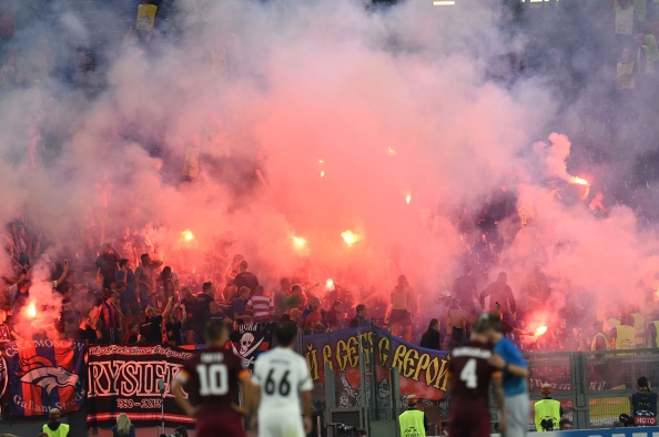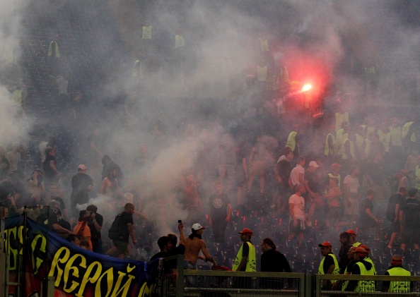 | Chứng kiến màn ăn mừng của CĐV nhà, những fan cuồng của CSKA Mowcow đốt pháo sáng nhằm khiêu chiến với người hâm mộ Roma và cảnh sát. |