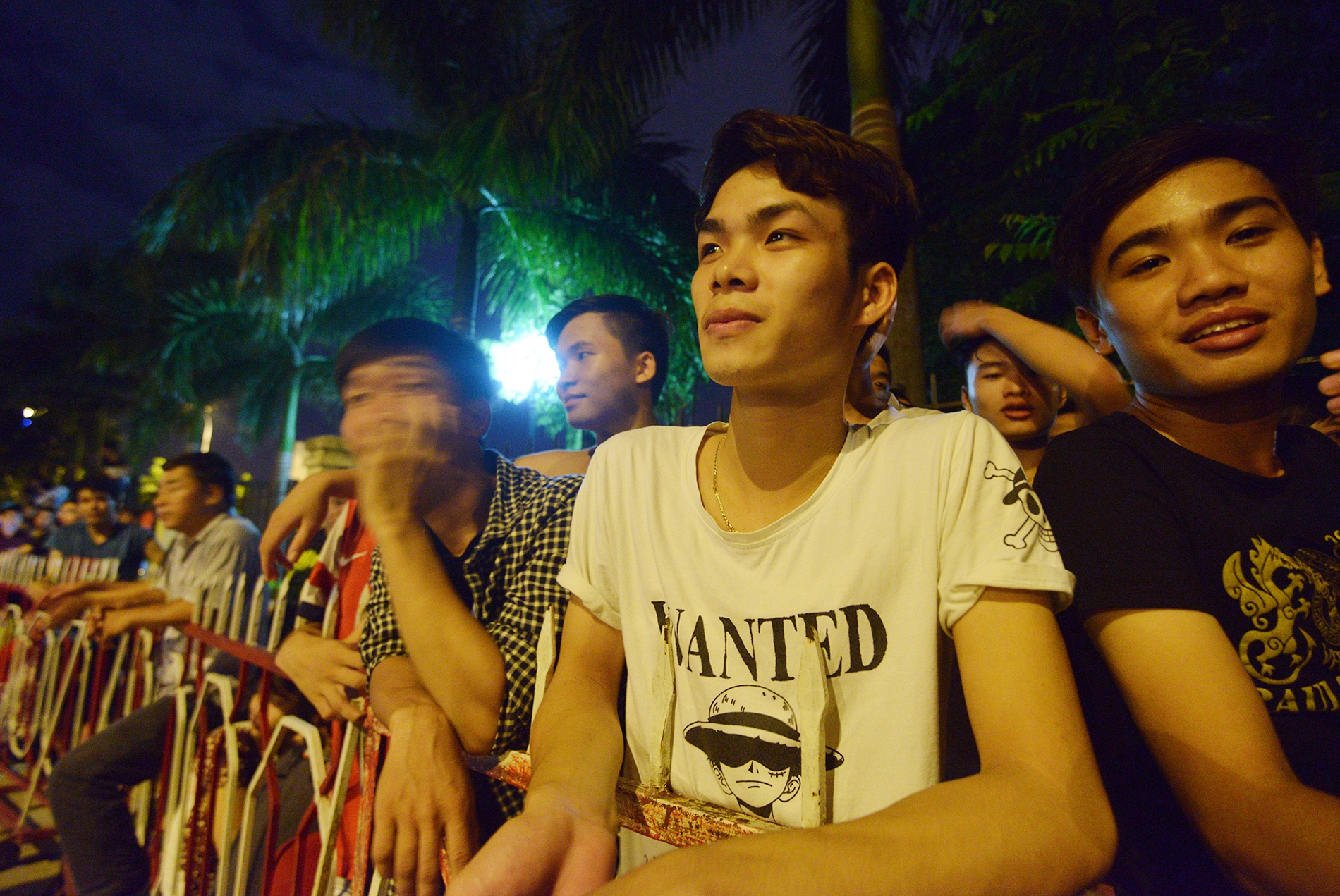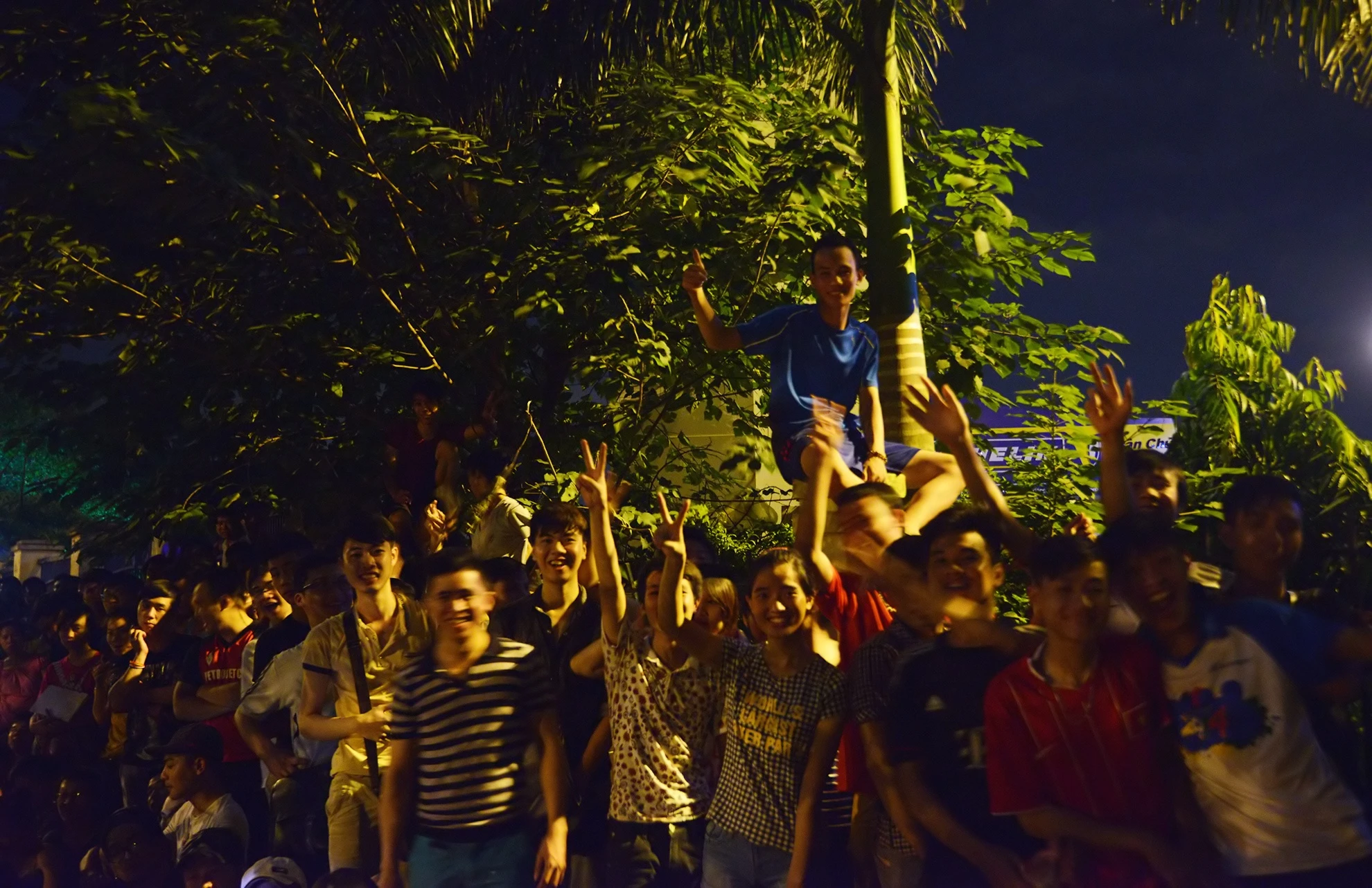 | Thức trắng cả đêm, nhưng không ai tỏ ra mệt mỏi. Có người còn trèo lên mố lan can để ngồi cho mát. |