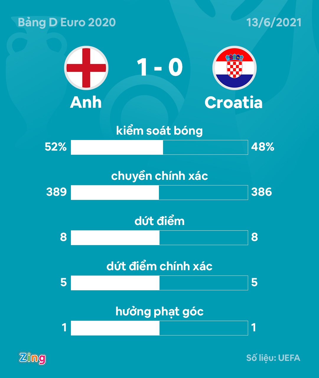 Thầy trò HLV Gareth Southgate thi đấu đầy chủ động trước Croatia. Sau hàng loạt nỗ lực gây sức ép, bàn thắng cũng đến với "Tam sư" ở đầu hiệp hai. Người ghi tên lên bảng tỷ số là Raheem Sterling. Công đầu thuộc về Kalvin Phillips với đường chọc khe chất lượng sau pha đột phá từ cánh phải.