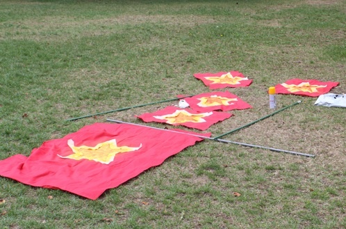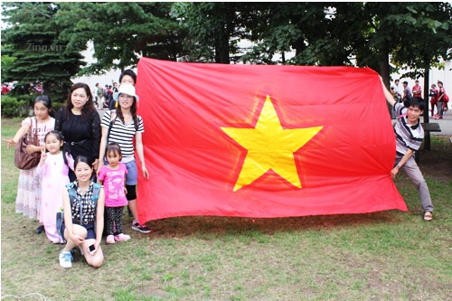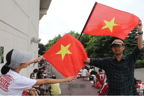 | Không tìm mua được lá cờ đỏ sao vàng, nhiều CĐV Nhật Bản phải dùng giấy để cắt, dán nhằm có được lá cờ Việt Nam cổ vũ cho trận đấu chiều nay. |