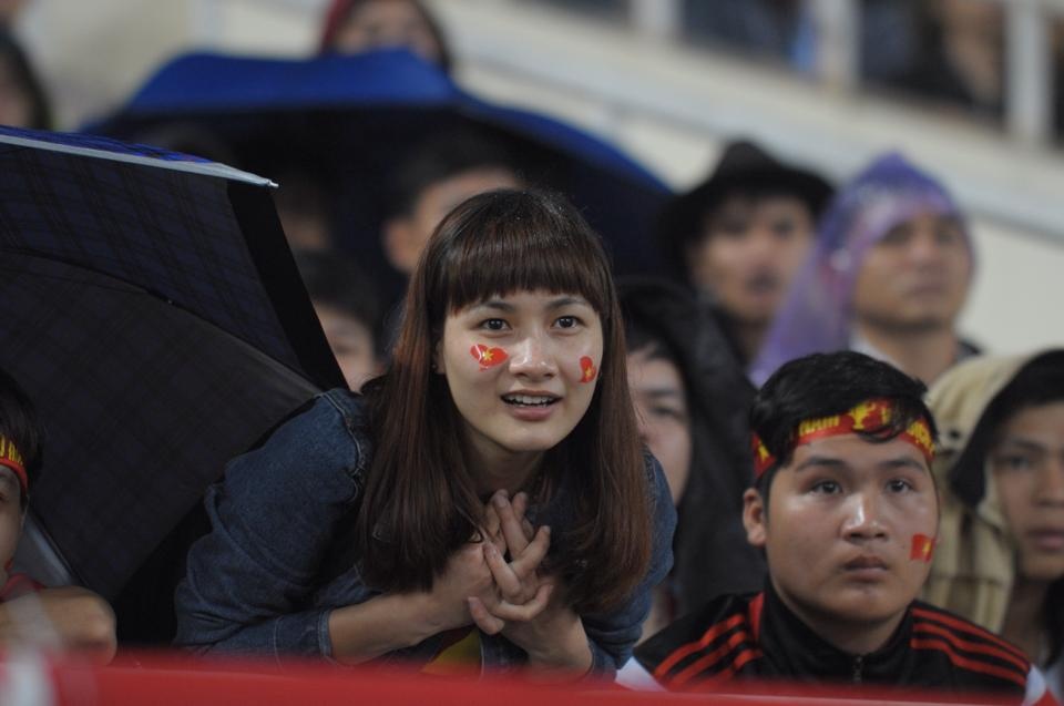 | Trời mưa nhưng nhiều CĐV nữ xinh đẹp vẫn có mặt trên sân Mỹ Đình ủng hộ thầy trò HLV Miura. |