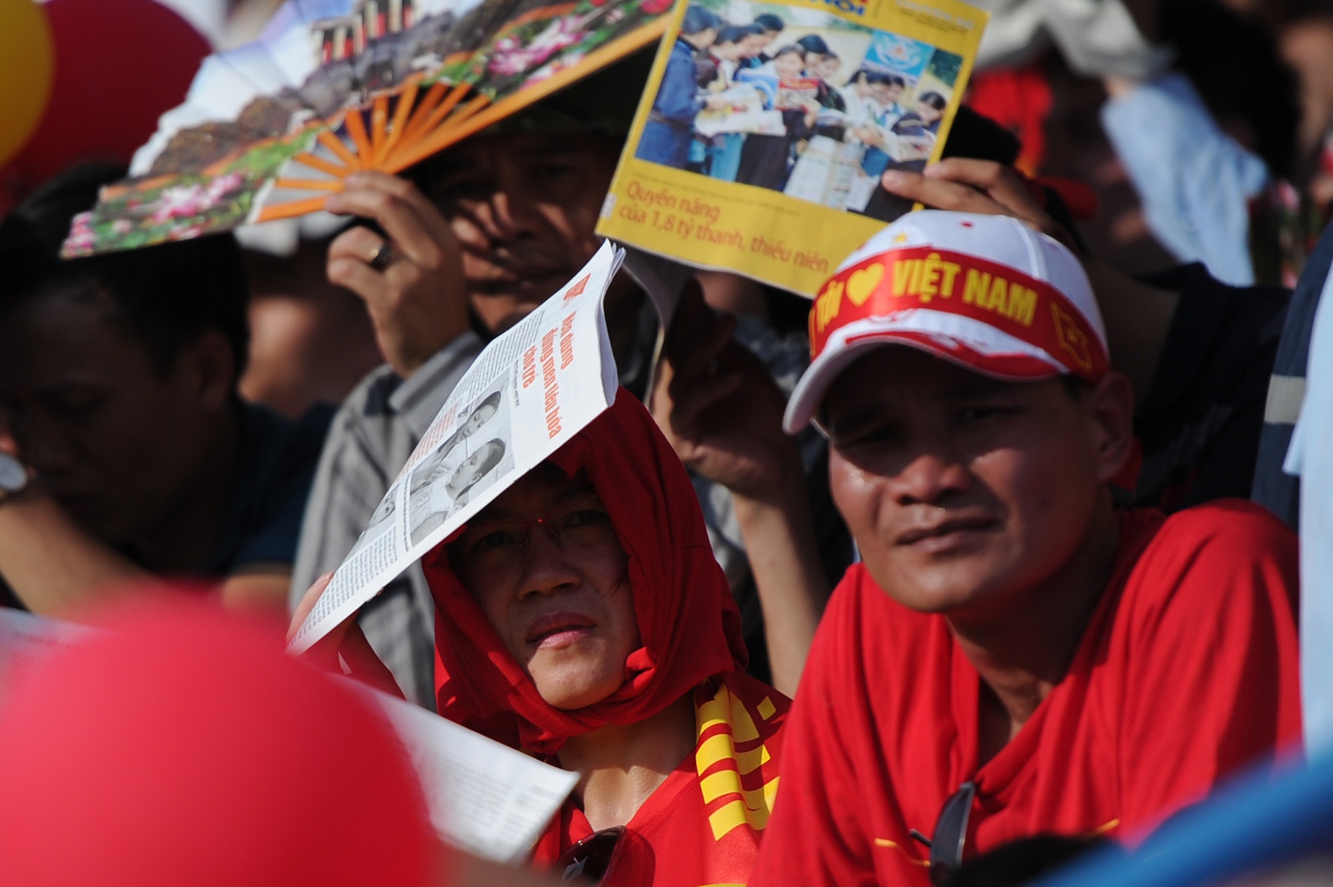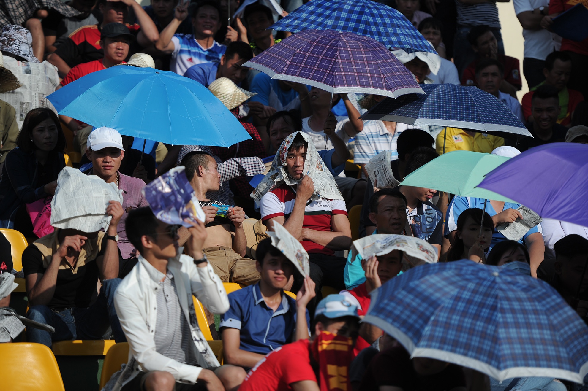 | Thời tiết khá nóng, nên nhiều CĐV phải dùng báo, quạt để che đầu. |