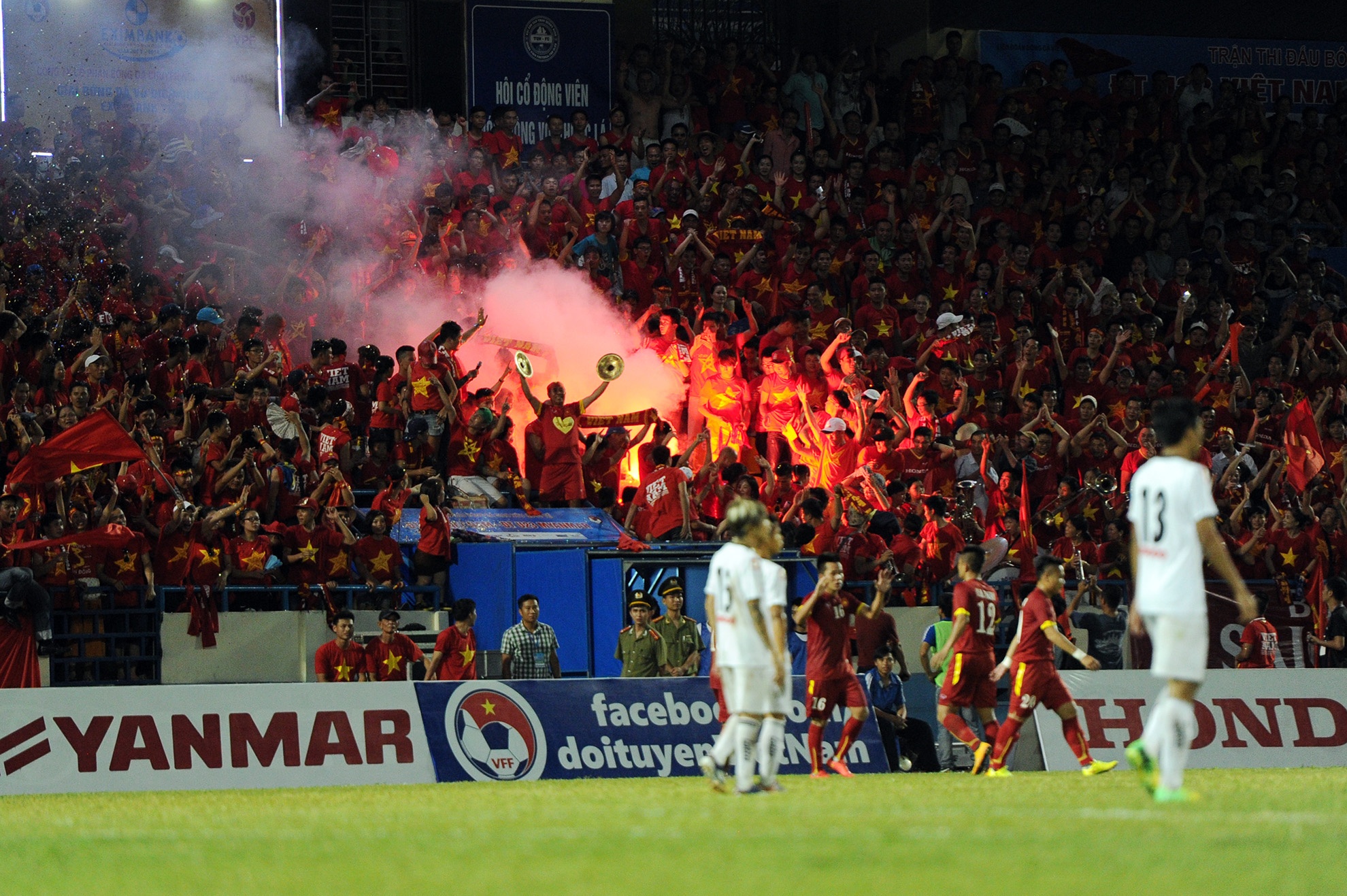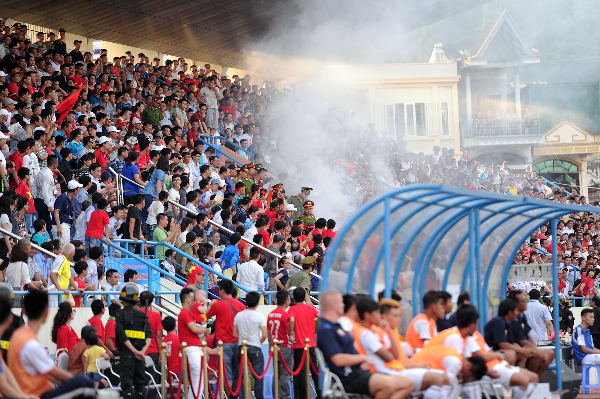 | Pháo sáng khiến không khí trên sân Cẩm Phả thêm cuồng nhiệt. |