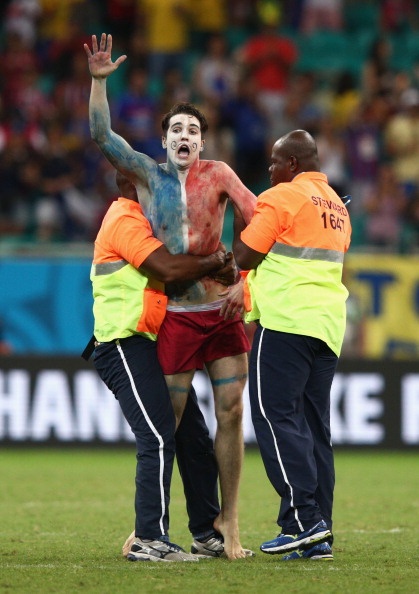 | Fan cuồng nhiệt của tuyển Pháp đã quá vui mừng khi đội nhà ghi bàn thắng thứ 5. Không kiềm chế được cảm xúc, anh vượt rào chạy xuống sân chia vui cùng các cầu thủ. |
