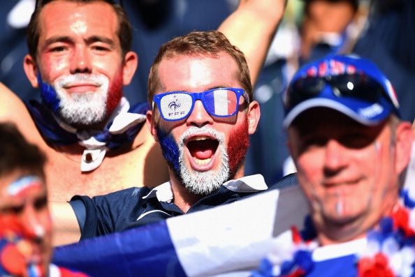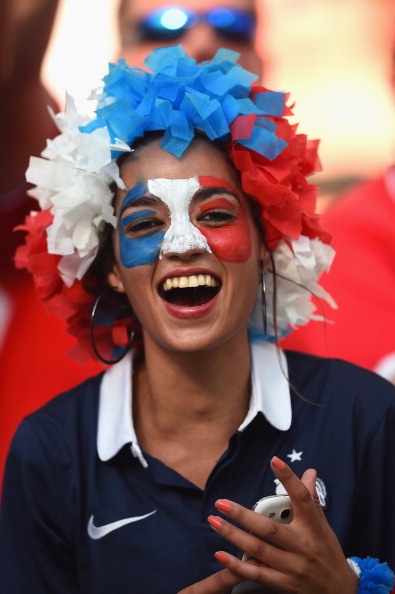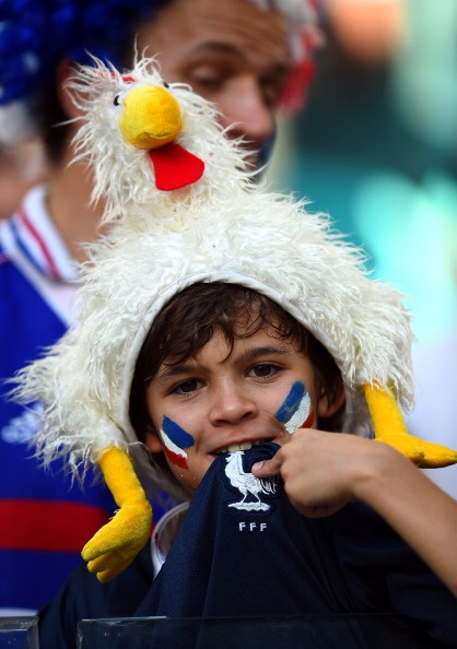 | Trên SVĐ Salvador còn có rất nhiều CĐV Pháp cuồng nhiệt khác. Ảnh: Một chiếc kính đặc biệt in hình cờ Pháp và chú gà trống Gôloa. |