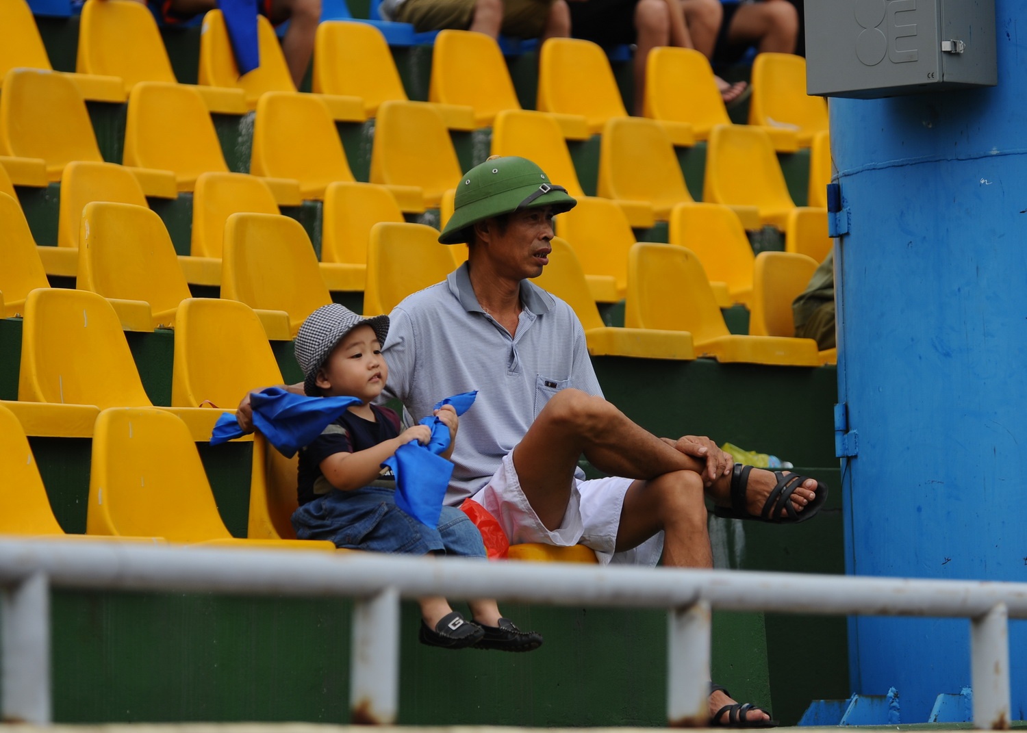 | Cháu nhỏ mới 3 tuổi theo ông đi xem bóng đá từ rất sớm ở khu vực khán đài C. |