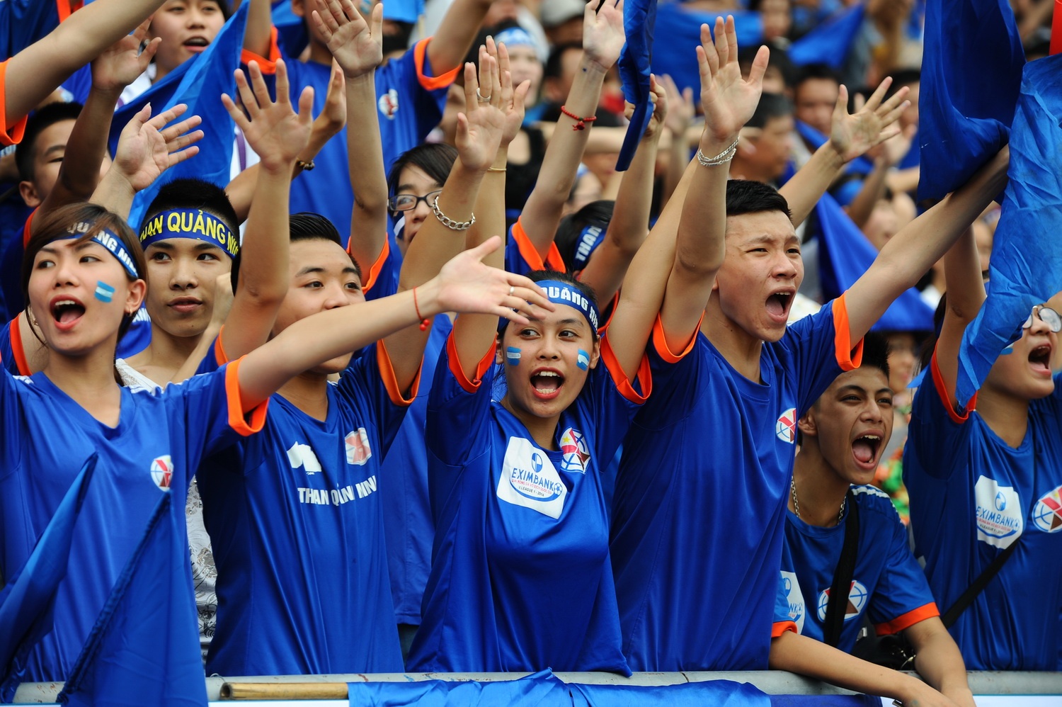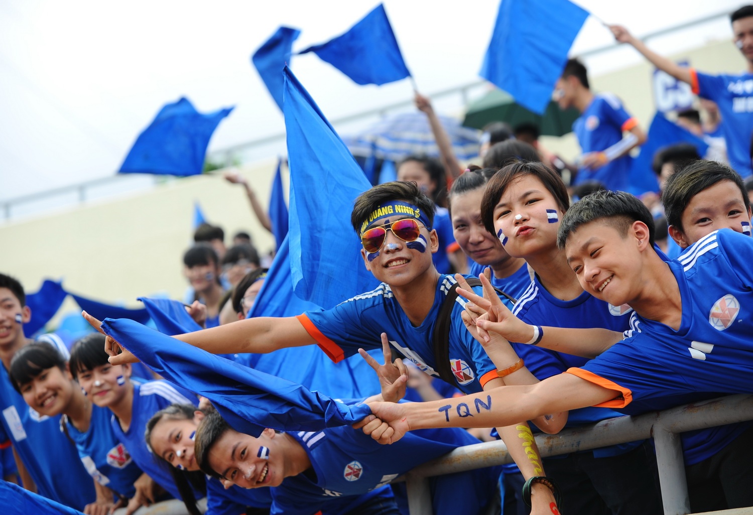 | Các bạn trẻ cháy cuồng nhiệt trên khán đài khi đội nhà giành chiến thắng 2-1 trước Sanna Khánh Hòa. |