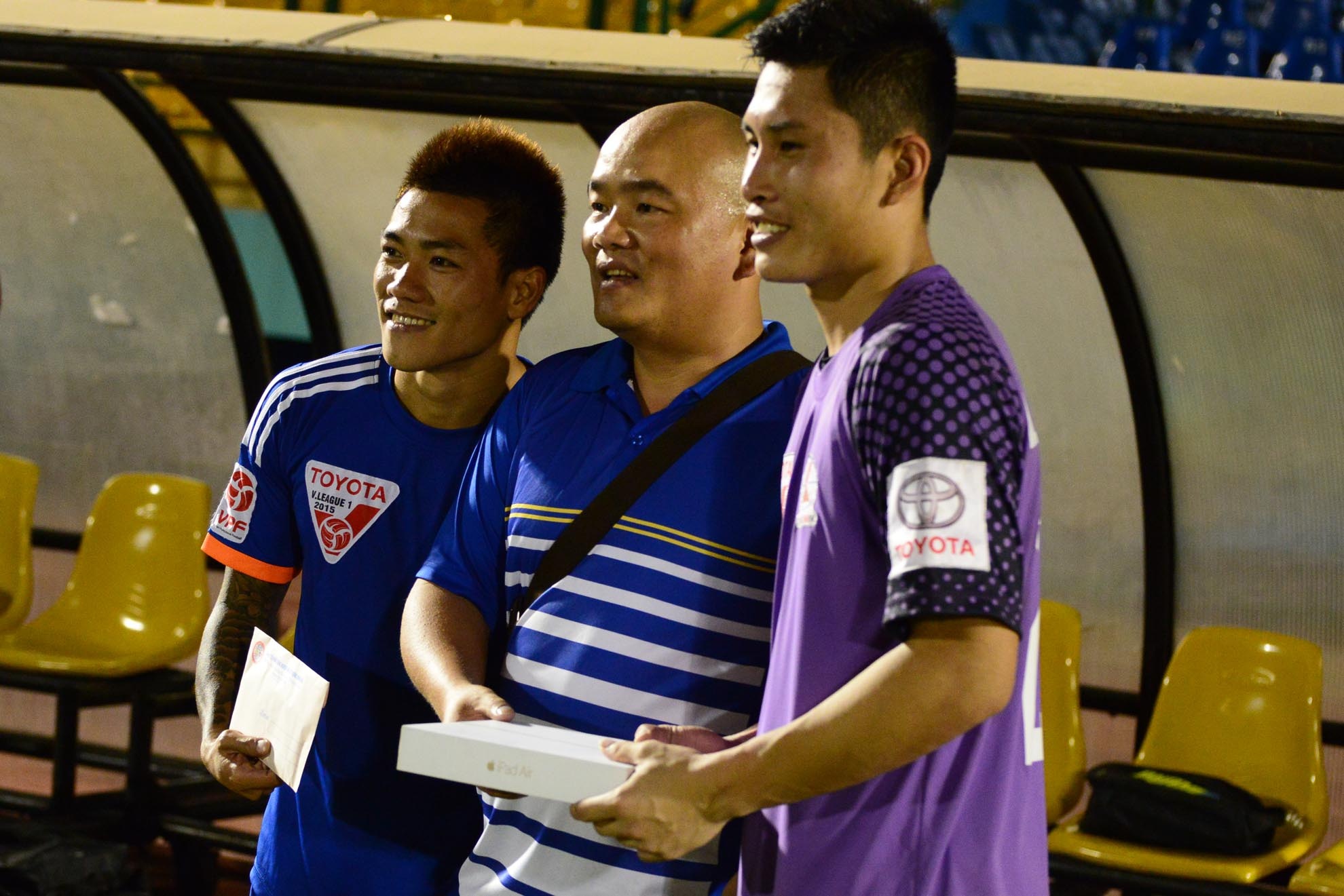 | Để khích lệ tinh thần các cầu thủ, ông Trần Lê Trung - chủ tịch hội CĐV Quảng Ninh đã hứa treo thưởng cho thủ môn Tuấn Linh nếu giữ sạch lưới. Khi trận đấu kết thúc, ông Trung đã xuống sân trao tặng iPad như đã hứa vì đội nhà giành chiến thắng dù bị thủng lưới. |