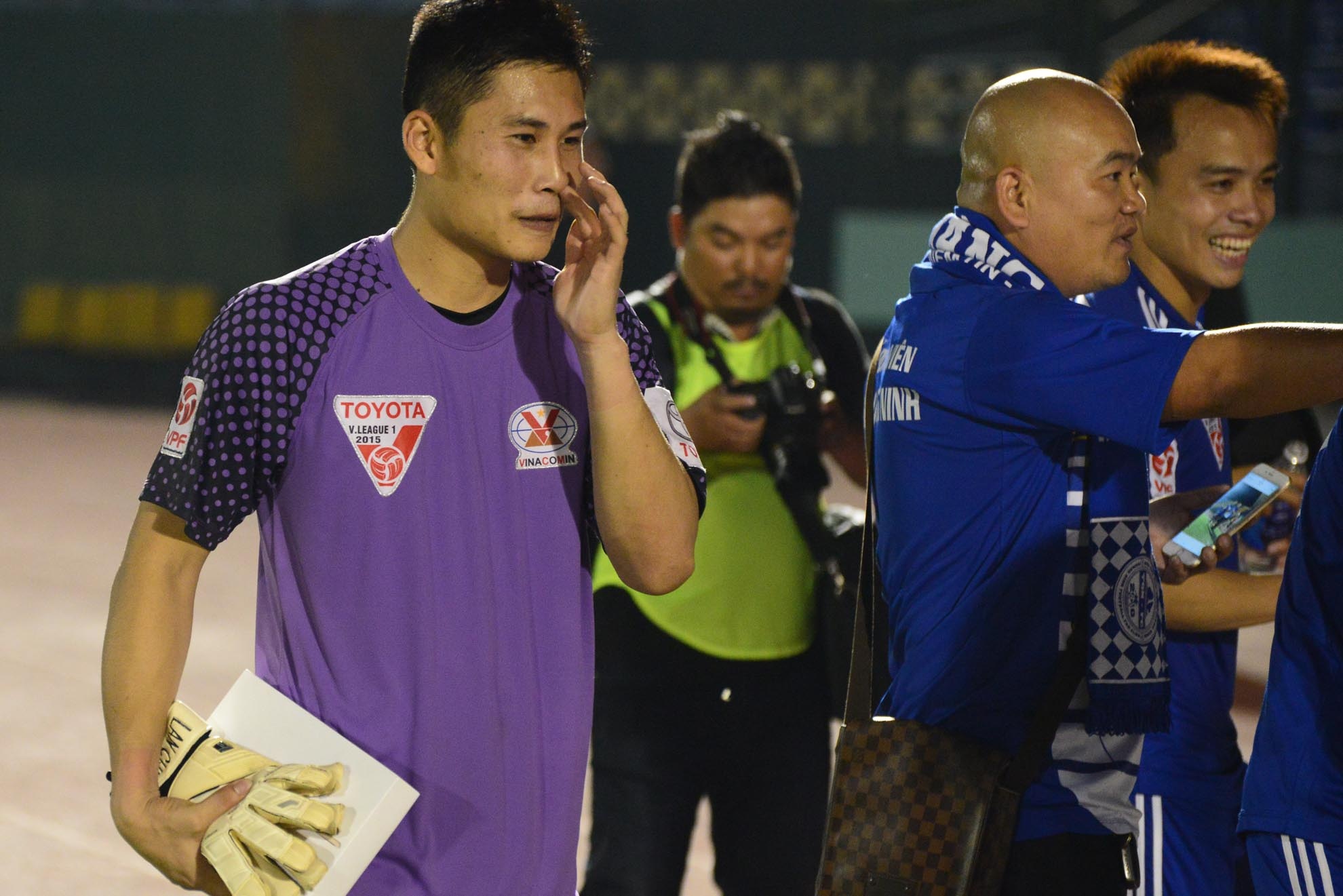 | Thủ môn Tuấn Linh vui vẻ khi được nhận quà từ hội CĐV đội nhà, đây là phần quà mang nhiều ý nghĩa về tinh thần cho các cầu thủ. |