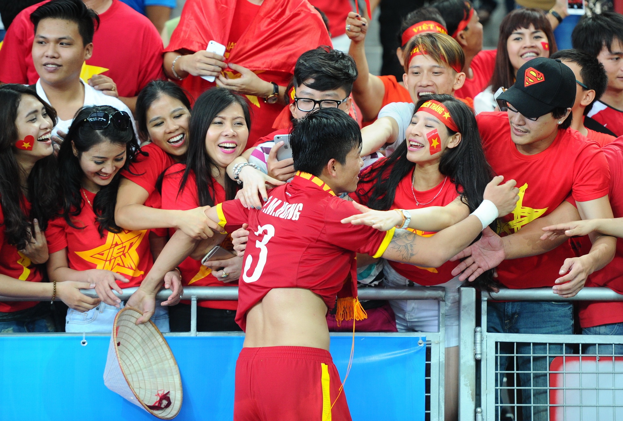 | Huy Toàn nhận được sự chúc mừng từ CĐV khi đóng góp cú đúp cho đội nhà trong trận gặp U23 Indonesia. Tình cảm của người hâm mộ là điểm tựa tinh thần giúp các học trò của HLV Miura vượt qua những thời điểm khó khăn tại SEA Games 28. |
