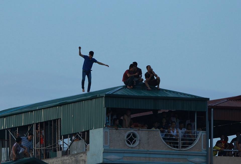 | CĐV Thanh Hóa leo mái nhà xem trận đấu giữa đội nhà và HAGL. Ảnh: Tùng Lê. |