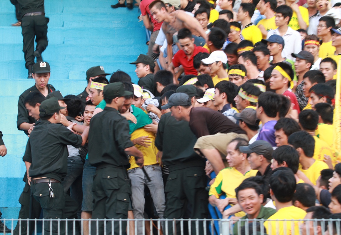 | Một CĐV quá khích bị bắt vì ném chai nước vào lực lượng an ninh. |