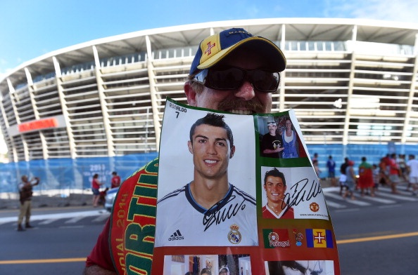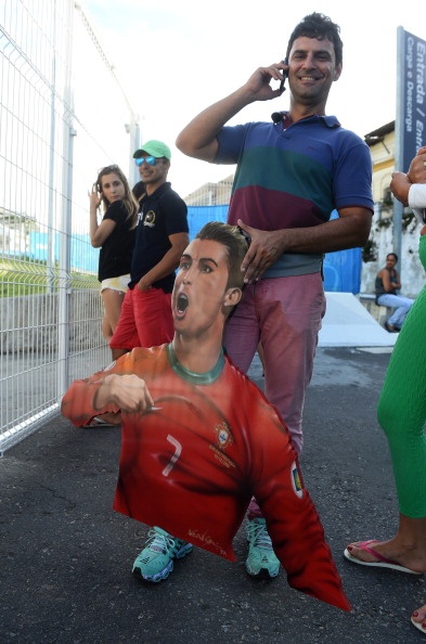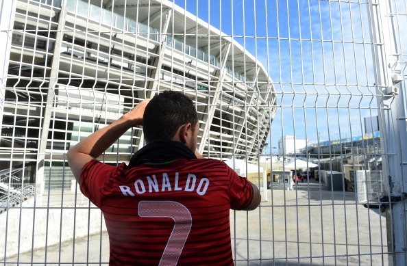| Một CĐV hâm mộ Ronaldo đứng bên ngoài sân Fonte Nova Arena ở Salvador. Khu tập luyện của ĐT Bồ Đào Nha được bảo vệ nghiêm ngặt. |