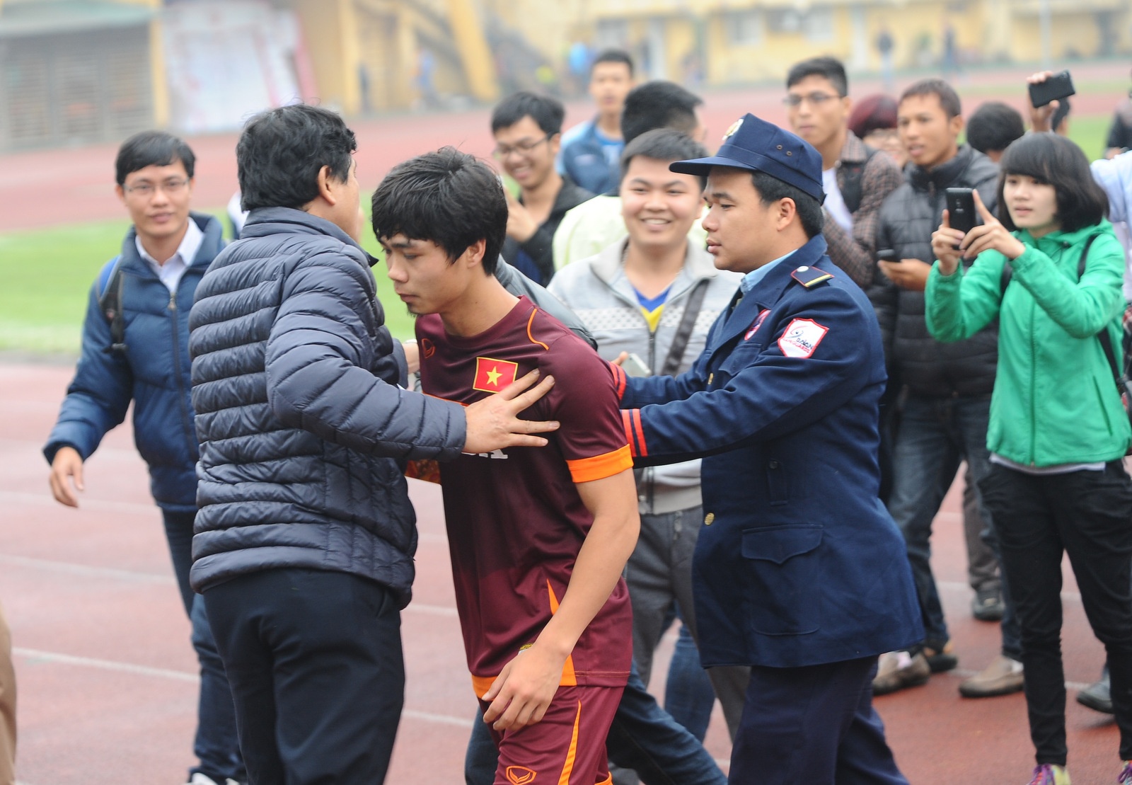 | Công Phượng vào sân ở hiệp 2 trong trận giao hữu giữa Olympic Việt Nam với Hà Nội T&T. Anh ghi bàn ấn định chiến thắng 3-1 cho Olympic Việt Nam. Sau trận đấu, Công Phượng phải rời sân với sự giúp đỡ của lực lượng an ninh sân Hàng Đẫy. |
