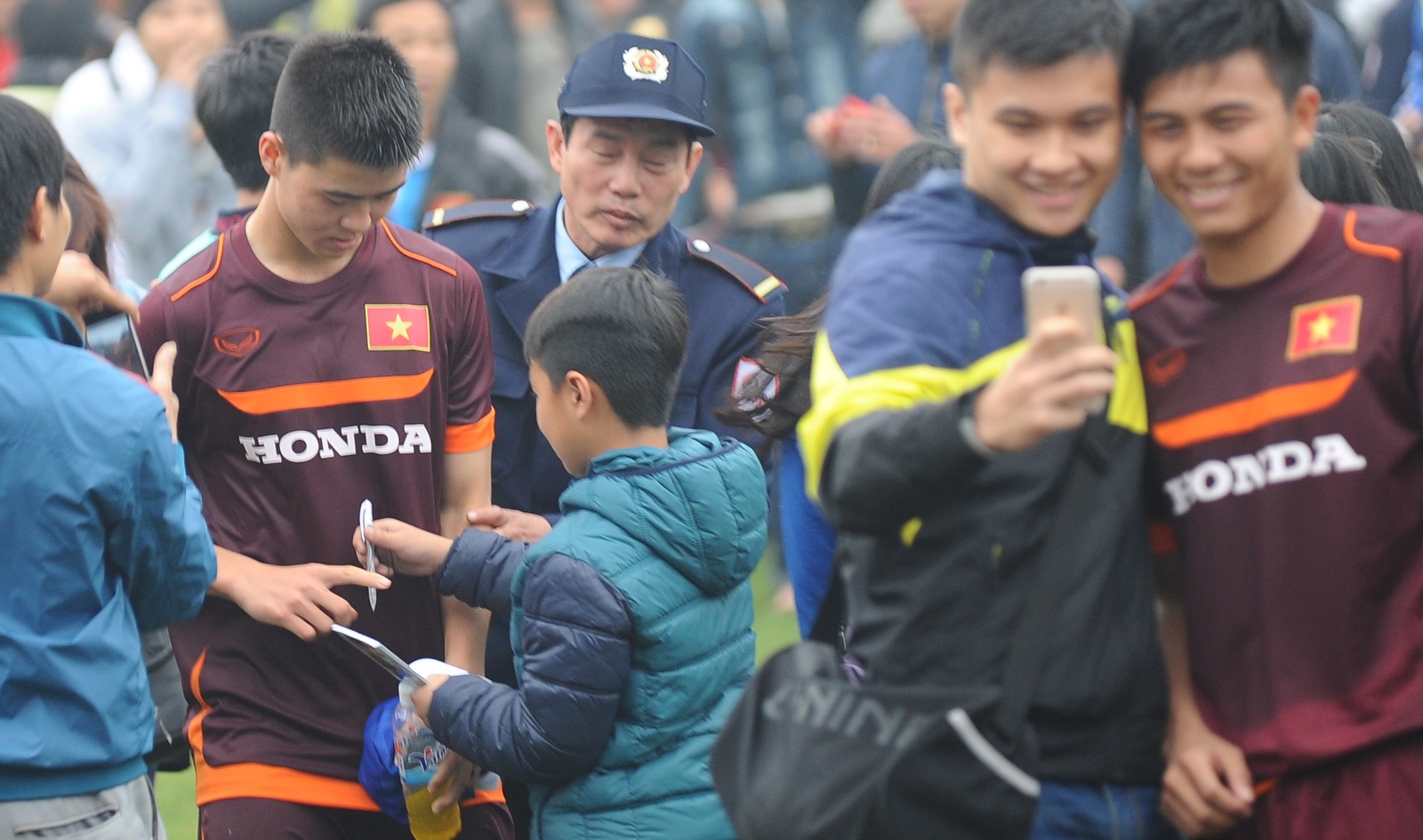 | Người hâm mộ phấn khích khi gặp Công Phượng nên lực lượng an ninh vất vả trong việc giúp Công Phượng thoát khỏi vòng vây của fan. |