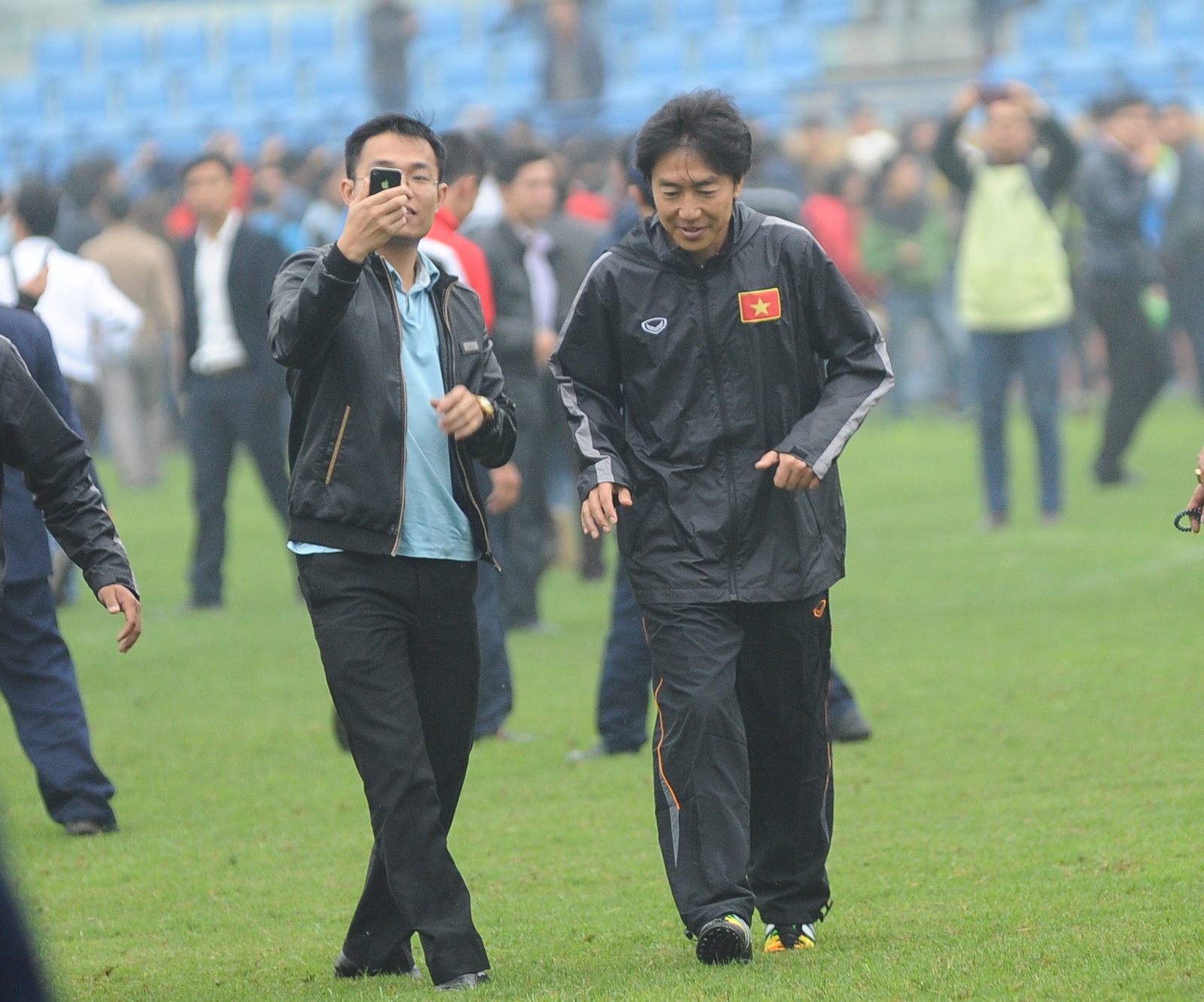 | HLV Miura sau khi kết thúc buổi họp báo cuối trận cũng phải chạy trốn người hâm mộ khi họ xin chụp ảnh cùng. |