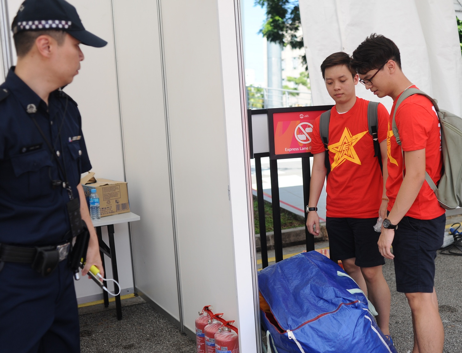 Còn đại kỳ buộc phải để ngoài, dù các CĐV Việt Nam nhiều lần thuyết phục lực lượng an ninh của sân Bishan.