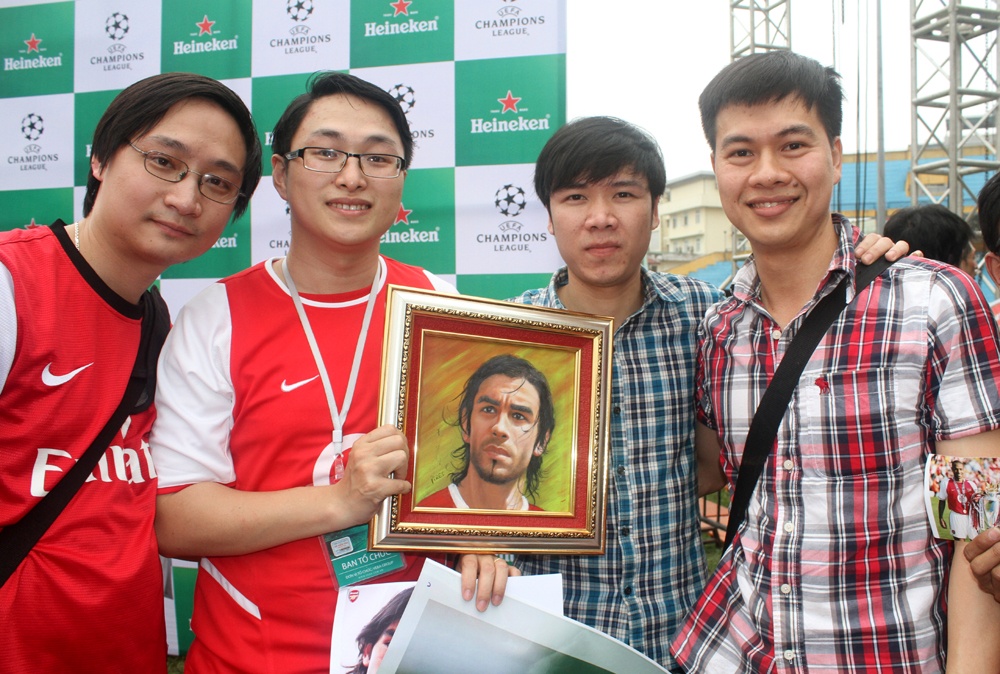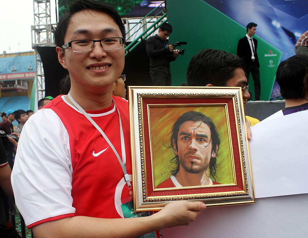 | Người vẽ bức tranh sơn dầu là Nguyễn Văn Thực (áo ca-rô, thứ 2 từ phải sang). Chàng trai sinh năm 1988 cho biết những ngày qua anh hồi hộp chờ Pires từ TP.HCM ra Hà Nội. CĐV Thực chia sẻ: "Em đã thức trắng đêm để vẽ bức tranh này, sáng ra lại phải cẩn thận làm khô. Từ 12h trưa em đã tới sân chờ Pires. Tuy xin được chữ ký của anh ấy nhưng hơi buồn là không được chụp hình chung cùng thần tượng". |