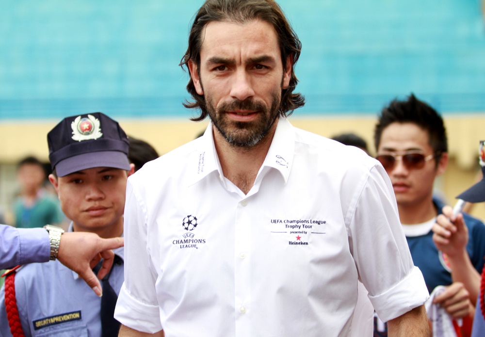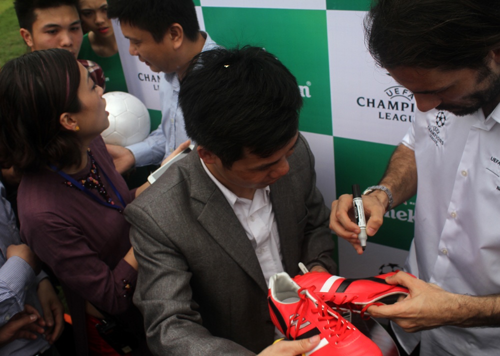 | Pires đứng trên thảm cỏ SVĐ Hàng Đẫy ký tặng người hâm mộ. |