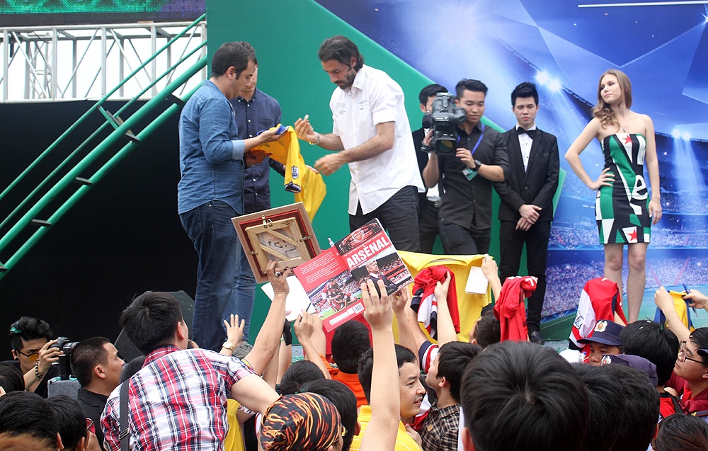 | "Running man" Vũ Xuân Tiến cũng đến đón Pires. Chàng trai từng chạy bộ đuổi theo thầy trò HLV Wenger cho biết anh yêu mến Pires nhưng mê Bergkamp hơn. |