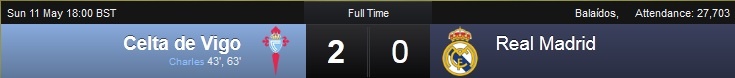 Trận đấu giữa Celta Vigo và Real Madrid đã khép lại với tỷ số 2-0 nghiêng về đội chủ nhà. Thất bại này khiến Real chính thức khép lại hy vọng vô địch mùa giải năm nay.
