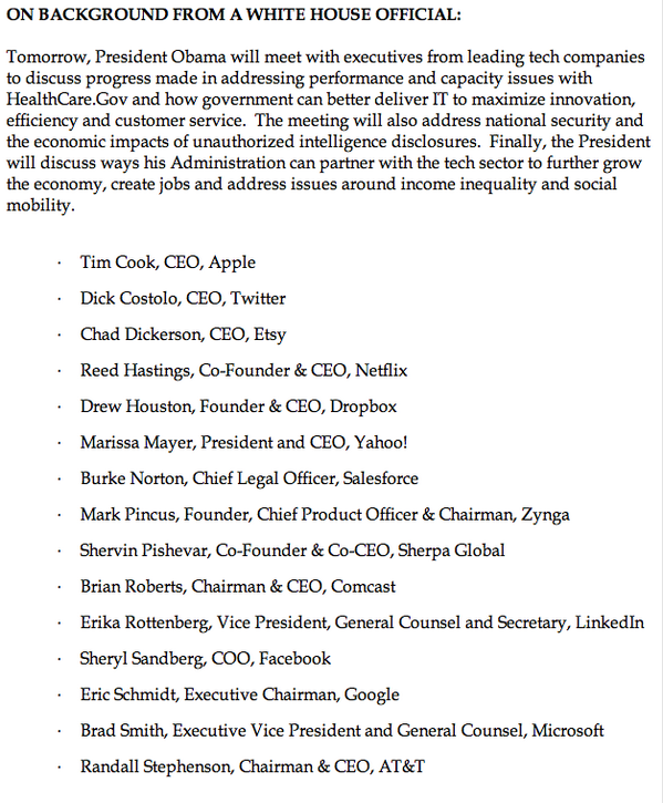 Theo một tuyên bố chính thức, tại hội nghị lần này các nhà lãnh đạo sẽ cùng thảo luận với tổng thống về sự thất bại của trang web Healthcare.gov - "bộ mặt" của dự án ObamaCare, chương trình giám sát NSA và vai trò của ngành công nghệ trong việc tạo ra việc làm. Hội nghị cũng sẽ bao gồm COO (Giám đốc điều hành) của Facebook Sheryl Sandberg, Chủ tịch điều hành Eric Schmidt của Google, và Marc Pincus người sáng lập hãng cung cấp trò chơi trực tuyến Zynga.