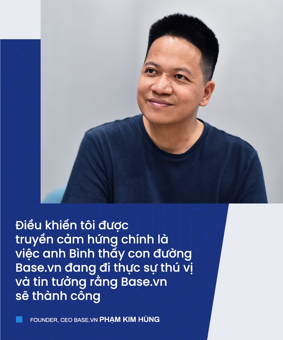 - Thời điểm đó, họ cũng chưa định hình được sản phẩm cụ thể là gì, chỉ nhìn thấy một startup luôn cam kết với sứ mệnh và có niềm tin mãnh liệt vào những thứ mình làm. Họ đầu tư vì biết rằng Base luôn cam kết và chắc chắn sẽ đi theo con đường riêng của mình. Anh Bình cũng là một trong những nhà đầu tư tin và hiểu điều đó.