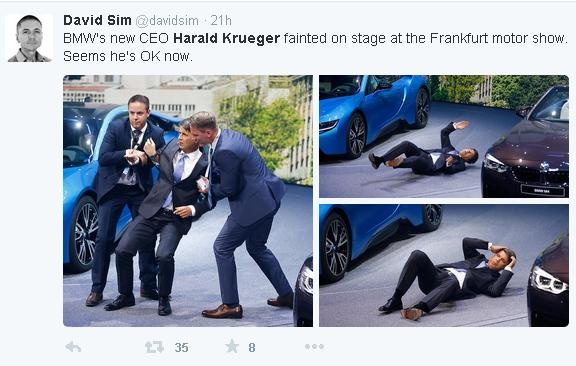 Tại triển lãm xe hơi Frankfurt Frankurt Motor Show diễn ra vào ngày 15/9, ông Harald Kruger đã gặp phải sự cố đáng tiếc trong bài thuyết trình đầu tiên với cương vị là CEO của BMW. Cụ thể, chỉ vài phút sau khi bắt đầu phát biểu giới thiệu về mẫu xe Series 7 mới của BMW, ông Harald Kruger bỗng nhiên đứng loạng choạng và ngã ngửa ngay trên sân khấu. Các trợ lý đã phải đỡ vị CEO này dậy và đưa đi cấp cứu. Buổi thuyết trình đã phải tạm hoãn ngay sau đó.
