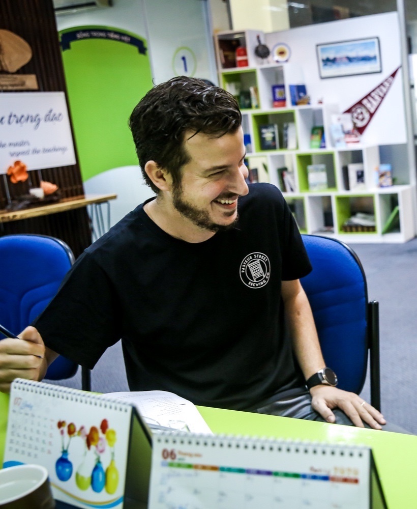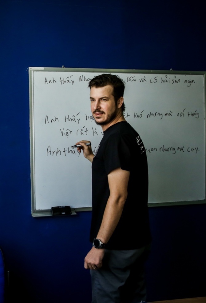 Dù đã sống và làm việc ở Việt Nam hơn 5 năm, Alex không biết nhiều về tiếng Việt. Anh giải thích rằng vì công việc bận rộn và được làm việc với nhiều bạn trẻ có thể sử dụng tiếng Anh thông thạo nên bản thân đã trì hoãn việc học tiếng nhiều lần. |