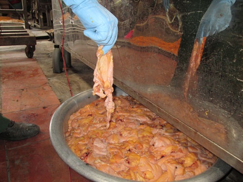 | Thịt gà thối độn bột mì thêm phụ gia, phẩm màu độc hại cho ra chà bông giá rẻ. |
