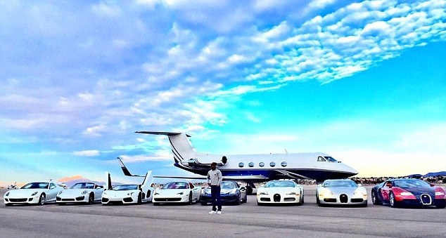 | Mayweather bên dàn siêu xe và phi cơ riêng. Ảnh: Daily Mail. |
