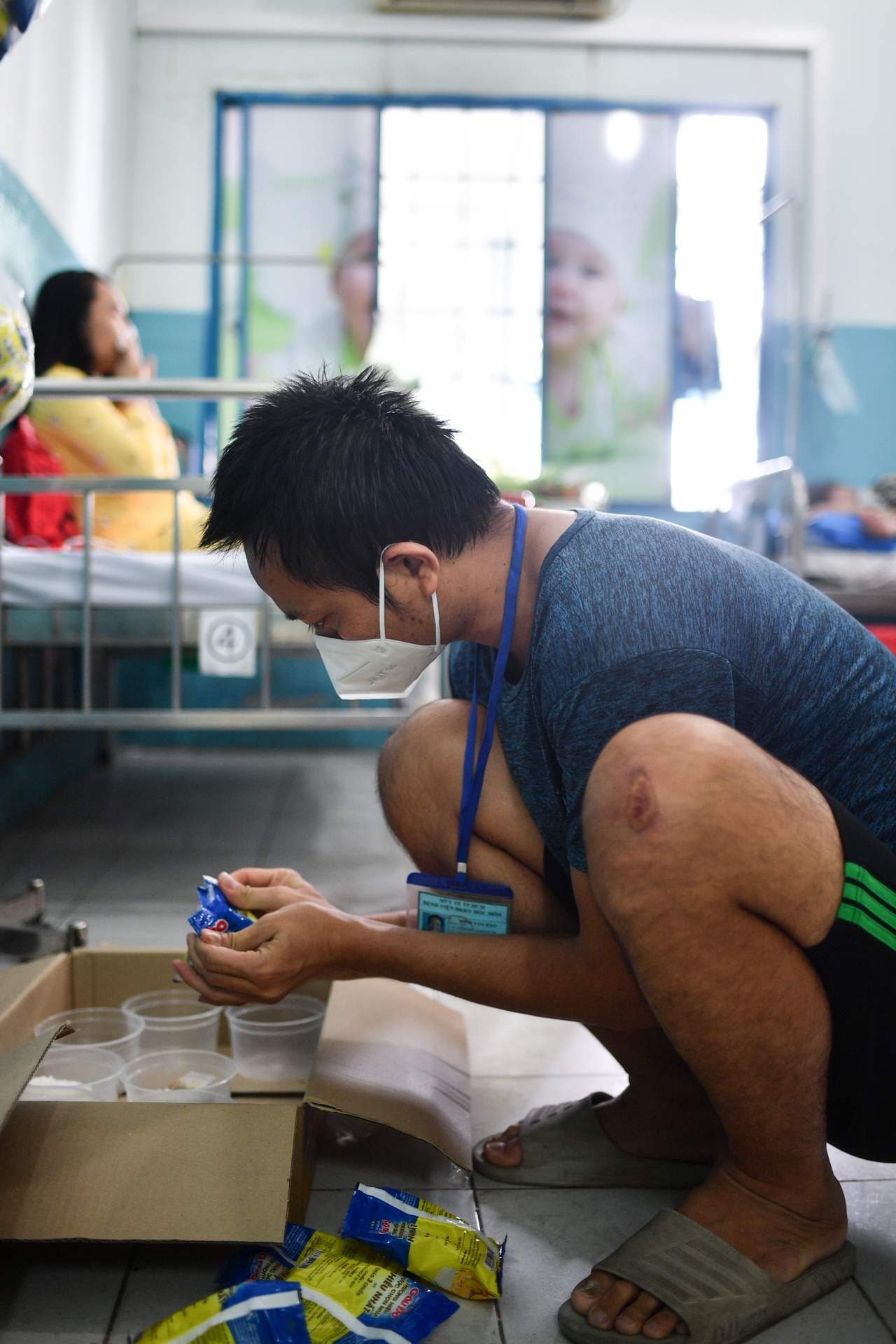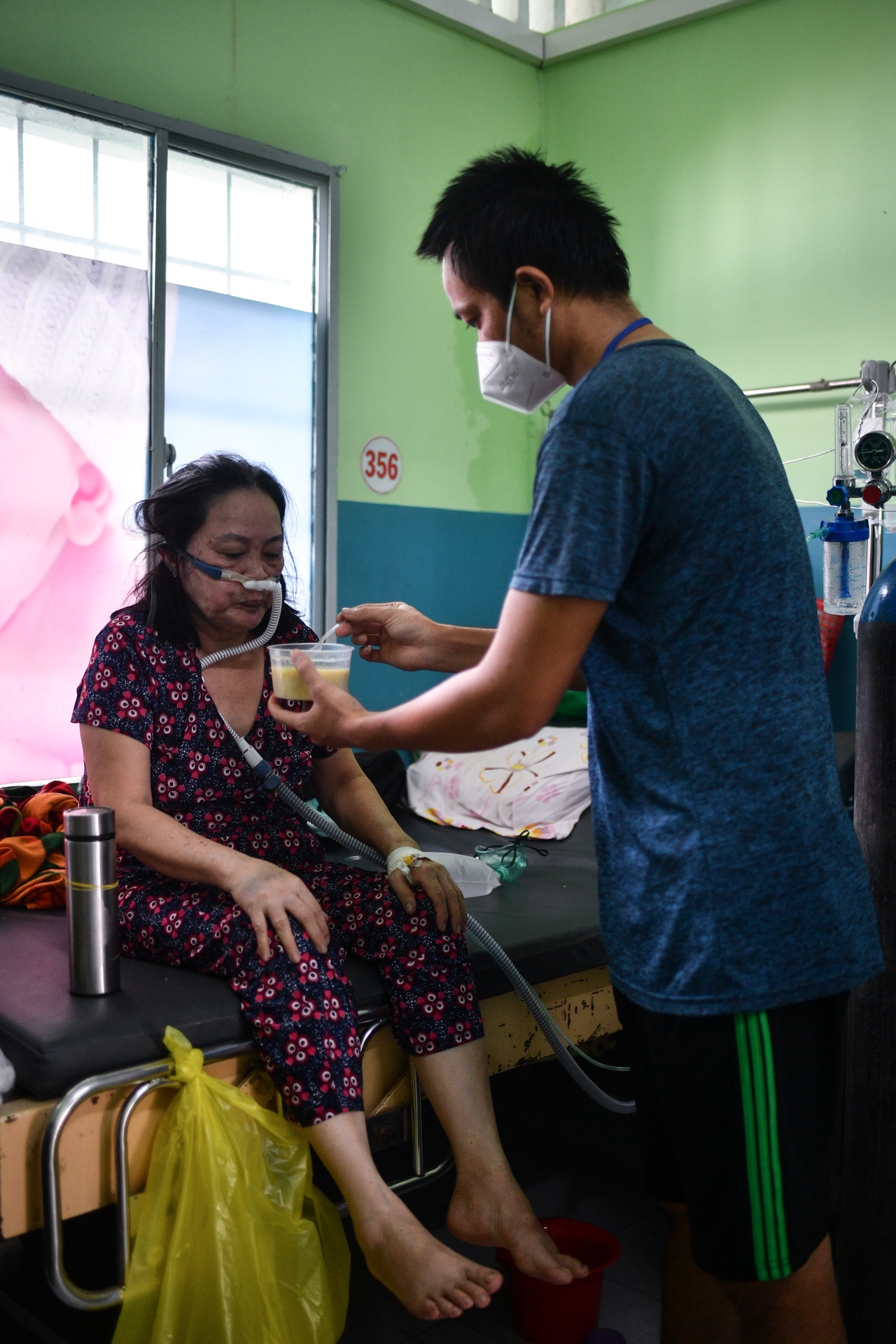 | "Làm tô cháo nóng cô T. ơi", anh Bão nói lớn. Vừa đưa thìa cháo cho bệnh nhân ăn, chúng tôi vừa trò chuyện, hỏi thăm sức khỏe người phụ nữ. Người phụ nữ nằm viện được hơn một tuần, hàng ngày vẫn phải thở oxy dòng cao mới có thể đáp ứng. |