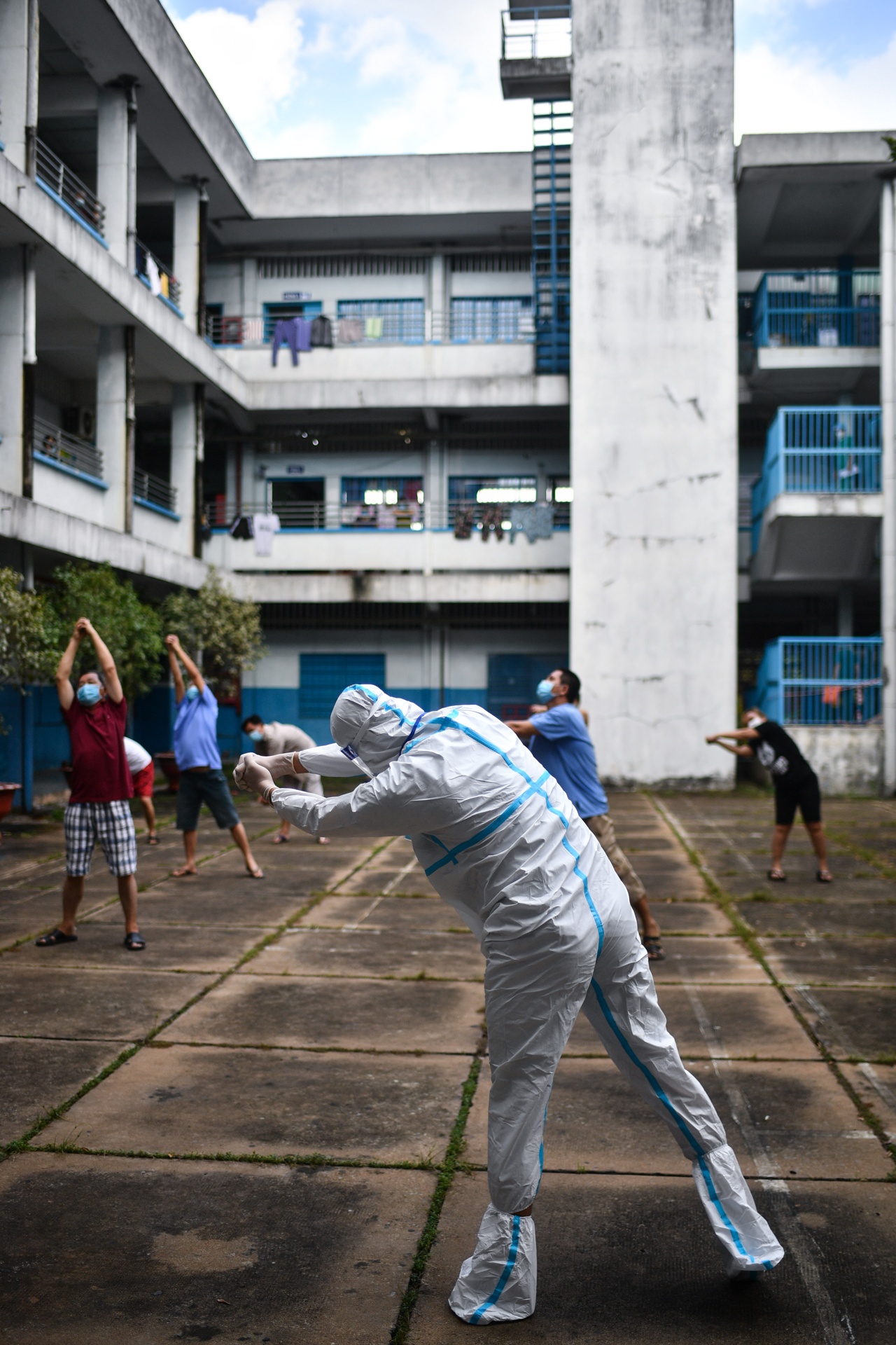 | "Tập thể dục các cô chú ơi", anh Bão đứng giữa sân nói lớn. Như một thói quen, mọi người từ lầu 1, 2 xuống sân đứng thẳng hàng và giãn cách. |