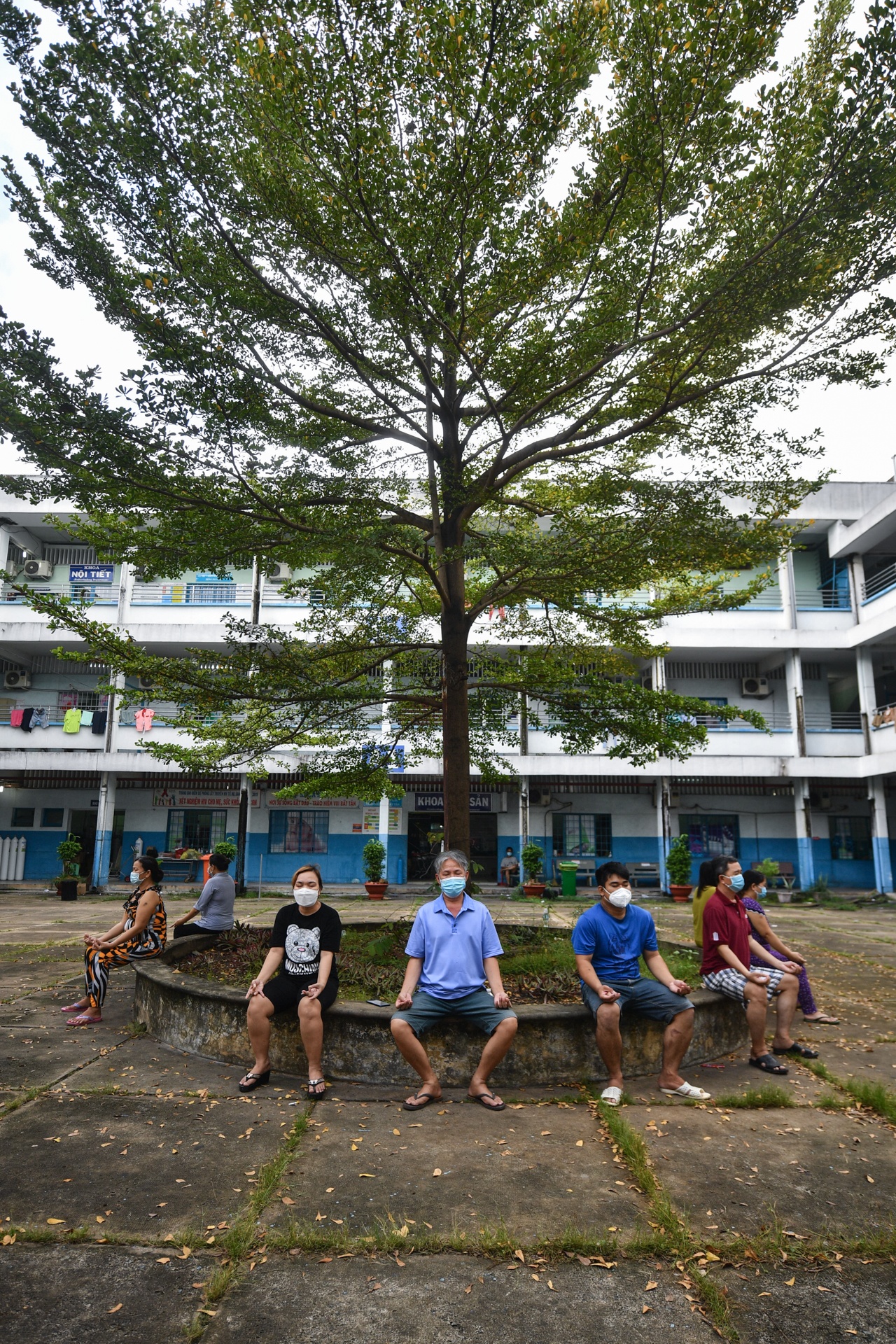 | Sau khi tập thể dục là bài tập thiền. Dưới gốc cây ở giữa sân bệnh viện, gần chục F0 cùng ngồi vừa nghỉ ngơi vừa ngồi thiền. Từng hồi phục vì sức khỏe tinh thần tốt, anh Tân nghĩ thiền là phương pháp dễ thực hiện và thư giãn nhất. |