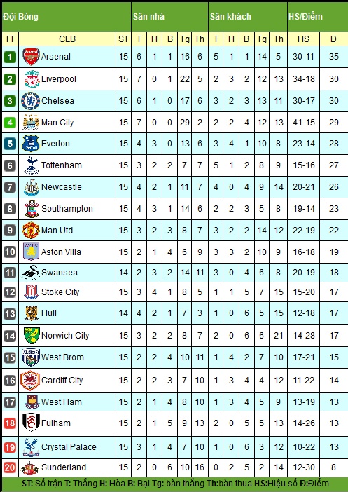 Bảng xếp hạng Ngoại hạng Anh sau vòng 15