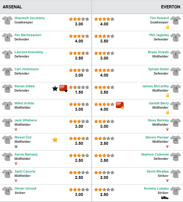 Sai lầm khiến Gibbs nhận điểm thấp nhất trận (điểm 1,5 trong thang điểm 5 theo đánh giá của trang Goal). Trong khi đó, những cầu thủ nhận điểm cao nhất trận gồm có thủ môn Howard, trung vệ Distin, tiền vệ Barry (Everton). Ở bên kia chiến tuyến, chỉ có một mình trung vệ Mertesacker nhận được điểm 4.