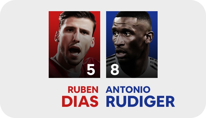 Ruben Dias sở hữu 6 pha phá bóng, tỷ lệ thắng tranh chấp 100%. Tuy nhiên, những thống kê này đều trở nên vô nghĩa khi trung vệ này đá phản lưới nhà ở phút 35. Trong khi đó, Antonio Rudiger hoàn thành tốt nhiệm vụ phòng ngự và sở hữu tỷ lệ chuyền chính xác 94%.