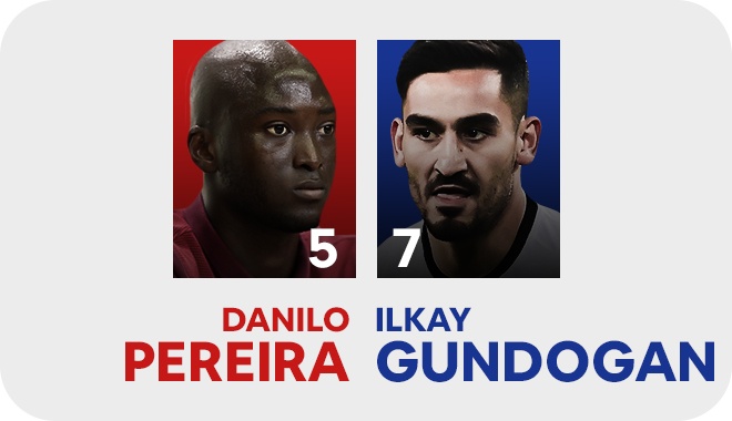 Danilo Pereira hoạt động chủ yếu ở trung lộ và không có nhiều sự hỗ trợ cho đồng đội khi tuyển Đức liên tục xuyên phá ở 2 cánh. Ở bên kia sân, Ilkay Gundogan kịp để lại dấu ấn bằng tỷ lệ chuyền chính xác 95% và tỷ lệ phát bóng dài chuẩn xác 75%.