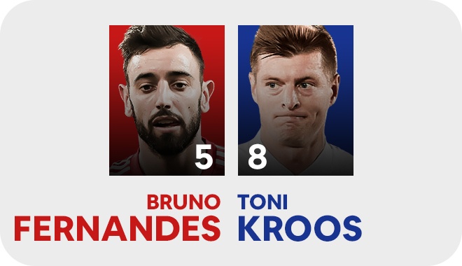 Bruno Fernandes có 90 phút nhạt nhòa. Anh chạm bóng 34 lần và không có nổi một cú sút hay lần tạo cơ hội nào. Trong khi đó, Toni Kroos vẫn cho thấy đẳng cấp hàng đầu trong từng pha xử lý. Anh chuyền chính xác 96% (cao nhất trên sân) và có 4 pha cắt bóng chuẩn xác.