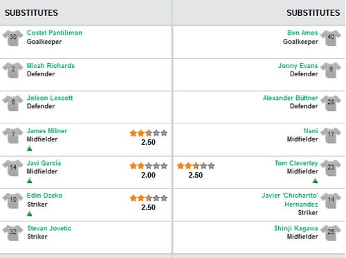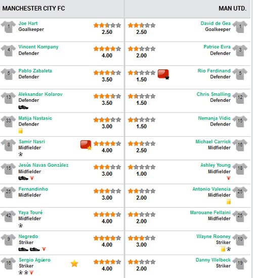 Về phía Man City, cầu thủ chơi hay nhất trận là Sergio Aguero. Tiền đạo người Argentina đã lập cú đúp cho đội chủ sân Etihad. Dù không ghi bàn cho Man xanh ở trận gặp MU, nhưng tân binh Negredo cũng đã chơi rất ấn tượng khi thực hiện hai pha kiến tạo cho đồng đội lập công. Sau trận đấu, có tới 4 cầu thủ Man City được trang Goal chấm điểm 4.