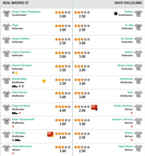 Màn trình diễn của Ronaldo, Bale lần lượt nhận điểm 4 và 3,5 từ trang Goal (chấm theo thang điểm 5). Với chiến thắng trước Rayo Vallecano, CLB Hoàng gia tiếp tục bám đuổi Barca và Atletico Madrid trong cuộc đua giành chức vô địch La Liga.